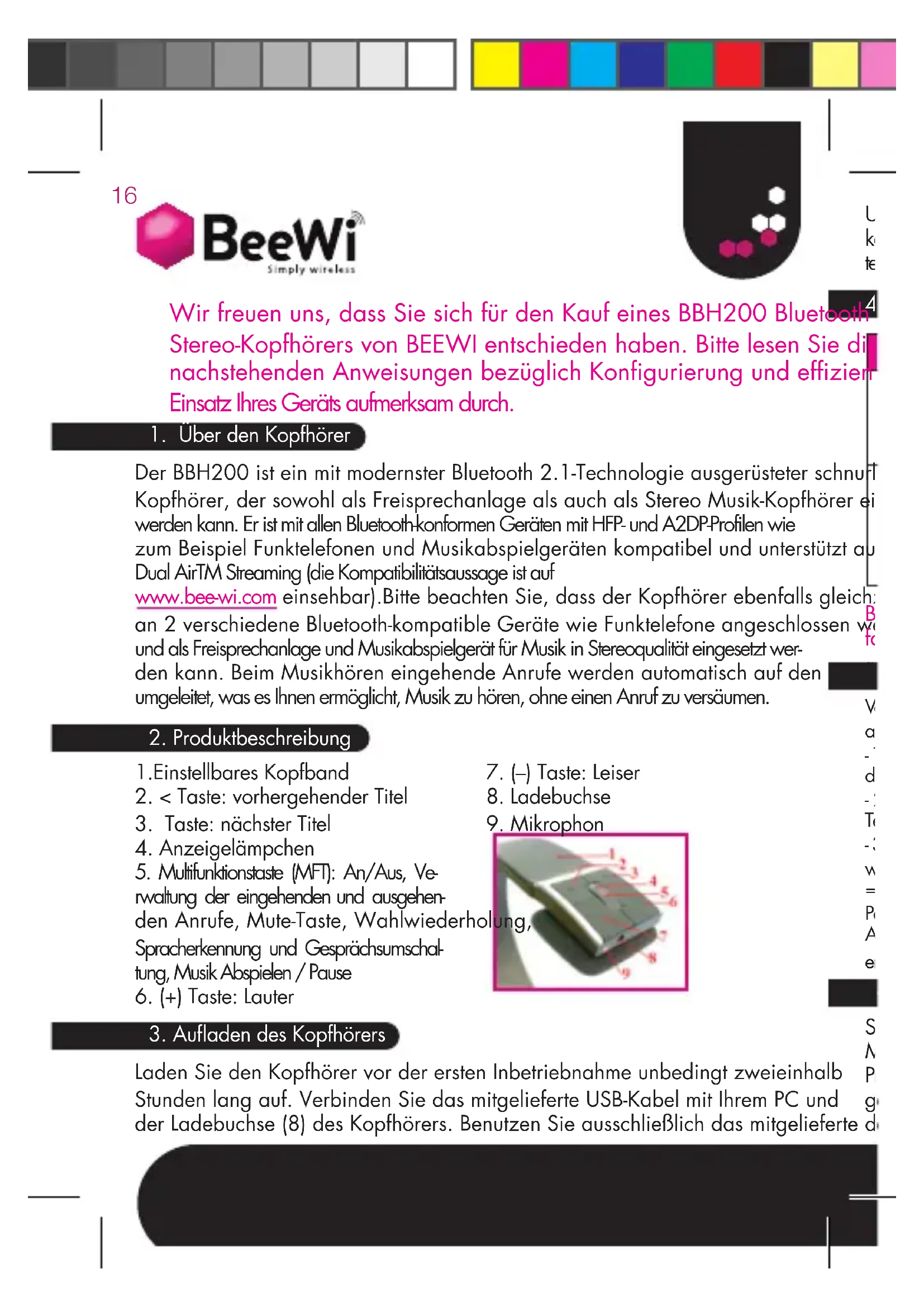 Der BBH200 ist ein mit modernster Bluetooth 2.1-Technologie ausgerüsteter schnurloser Kopfhörer, der sowohl als Freisprechanlage als auch als Stereo Musik-Kopfhörer eingesetzt werden kann. Er ist mit allen Bluetooth-konformen Geräten mit HFP- und A2DP-Profilen wie zum Beispiel Funktelefonen und Musikabspielgeräten kompatibel und unterstützt außerdem Dual AirTM Streaming (die Kompatibilitätsaussage ist auf www.bee-wi.com einsehbar).Bitte beachten Sie, dass der Kopfhörer ebenfalls gleichzeitig an 2 verschiedene Bluetooth-kompatible Geräte wie Funktelefone angeschlossen werden und als Freisprechanlage und Musikabspielgerät für Musik in Stereoqualität eingesetzt wer- den kann. Beim Musikhören eingehende Anrufe werden automatisch auf den Kopfhörer umgeleitet, was es Ihnen ermöglicht, Musik zu hören, ohne einen Anruf zu versäumen. Laden Sie den Kopfhörer vor der ersten Inbetriebnahme unbedingt zweieinhalb Stunden lang auf. Verbinden Sie das mitgelieferte USB-Kabel mit Ihrem PC und der Ladebuchse (8) des Kopfhörers. Benutzen Sie ausschließlich das mitgelieferte