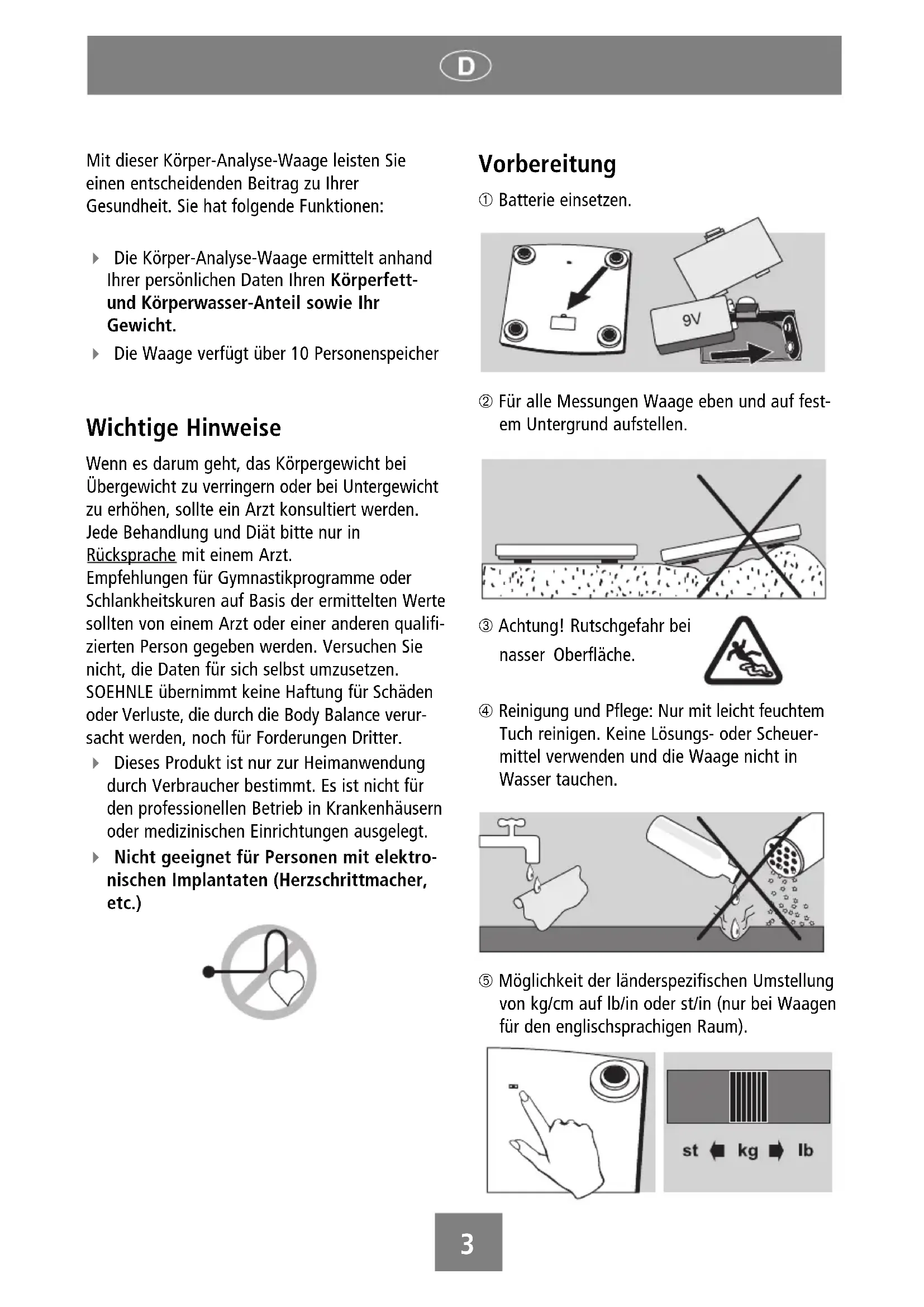 Wenn es darum geght, das Körpersgewicht bei Übergewicht zu verringn oder bei Untergewicht zu erhöhen, sollte ein Arzt konsultiert werden. Jede Behandlung und Diätitte nur in Rücksprache mit einem Arzt. Empfehlungen für Gymnastikprogramme oder Schlankheitskuren auf Basis der ermittelten Werte sollen den einem Arzt oder einer anderen qualifi-zierten Person gegeben werden. Versuchen Sie nicht, die Daten fur sich selbst umzusetzen. SOEHNLE übernimmt keine Haftung fur Schäden oder Verluste, die durch die Body Balance verursacht werden, noch fur Forderungen Dritter.
