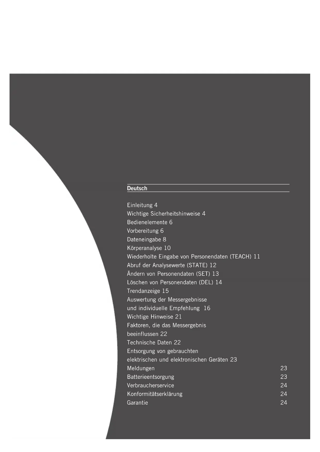 Vielen Dank, dass Sie sich zum Kauf dieser Soehnle Körperanalysewaage entschieden haben. Dieses Markenprodukt wird Sie bei der Beurteilung Ihres Körperstatus unterstützen. Bitte lesen Sie vor der ersten Inbetriebnahme diese Bedienungsanleitung sorgfältig durch und machen Sie sich mit dem Gerät vertraut. Bewahren Sie diese Bedienungsanleitung gut auf, damit Ihnen die Informationen jederzeit zur Verfügung stehen.