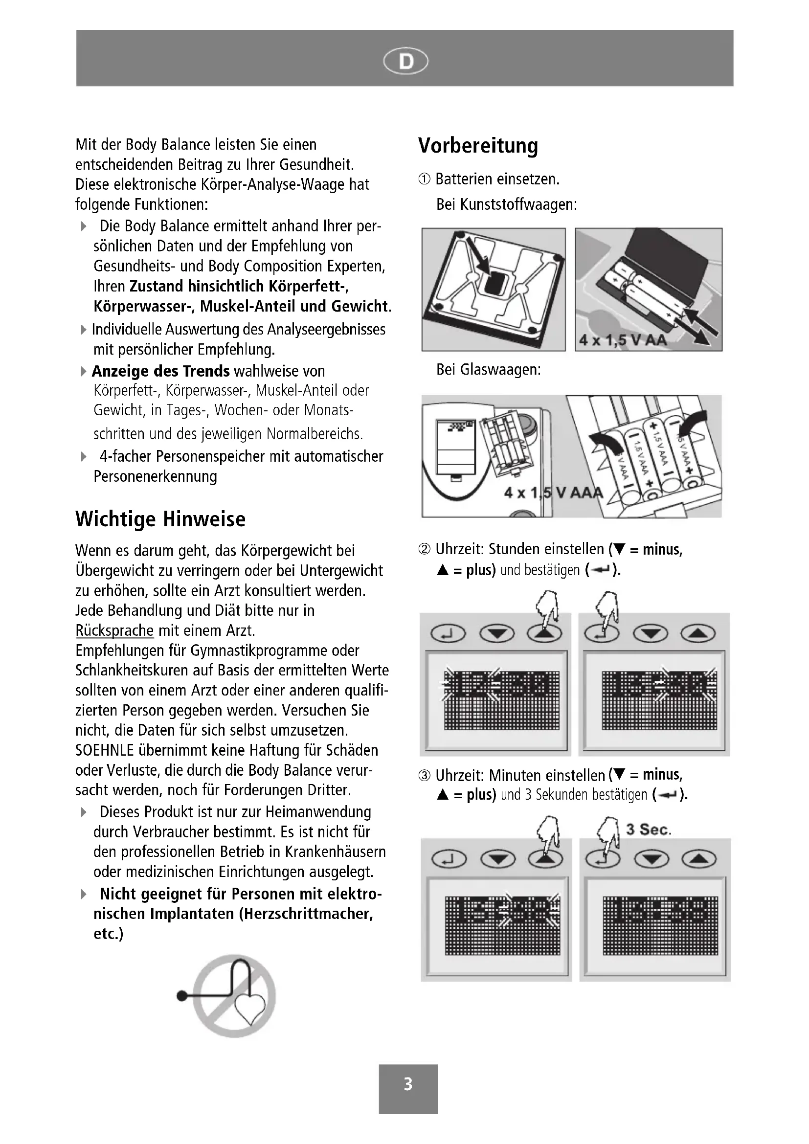 - hrvatski BA_63711_neu_V8.qxd 18.01.2006 13:52 Uhr Seite 23 Mit der Body Balance leisten Sie einen entscheidenden Beitrag zu Ihrer Gesundheit. Diese elektronische Körper-Analyse-Waage hat folgende Funktionen: Die Body Balance ermittelt anhand Ihrer per- sönlichen Daten und der Empfehlung von Gesundheits- und Body Composition Experten, Ihren Zustand hinsichtlich Körperfett-, Körperwasser-, Muskel-Anteil und Gewicht. Individuelle Auswertung des Analyseergebnisses mit persönlicher Empfehlung. Anzeige des Trends wahlweise von Körperfett-, Körperwasser-, Muskel-Anteil oder Gewicht, in Tages-, Wochen- oder Monats- schritten und des jeweiligen Normalbereichs. 4-facher Personenspeicher mit automatischer Personenerkennung Wichtige Hinweise Wenn es darum geht, das Körpergewicht bei Übergewicht zu verringern oder bei Untergewicht zu erhöhen, sollte ein Arzt konsultiert werden. Jede Behandlung und Diät bitte nur in Rücksprache mit einem Arzt. Empfehlungen für Gymnastikprogramme oder Schlankheitskuren auf Basis der ermittelten Werte sollten von einem Arzt oder einer anderen qualifi- zierten Person gegeben werden. Versuchen Sie nicht, die Daten für sich selbst umzusetzen. SOEHNLE übernimmt keine Haftung für Schäden oder Verluste, die durch die Body Balance verur- sacht werden, noch für Forderungen Dritter. Dieses Produkt ist nur zur Heimanwendung durch Verbraucher bestimmt. Es ist nicht für den professionellen Betrieb in Krankenhäusern oder medizinischen Einrichtungen ausgelegt. Nicht geeignet für Personen mit elektro- nischen Implantaten (Herzschrittmacher, etc.) Vorbereitung ➀ Batterien einsetzen. Bei Kunststoffwaagen: Bei Glaswaagen: ➁ Uhrzeit: Stunden einstellen (▼ = minus, ▲ = plus) und bestätigen p. 173
