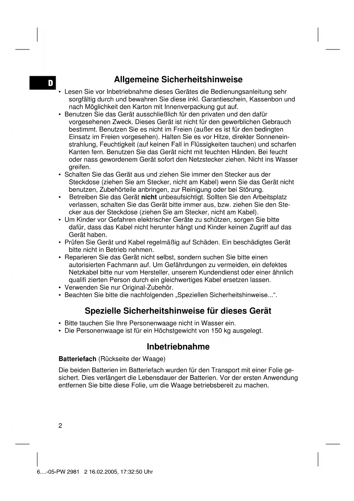 - Die Personenwaage ist für ein Höchstgewicht von 150 kg ausgelegt. Inbetriebnahme Batteriefach (Rückseite der Waage) Die beiden Batterien im Batteriefach wurden für den Transport mit einer Folie ge- sichert. Dies verlängert die Lebensdauer der Batterien. Vor der ersten Anwendung entfernen Sie bitte diese Folie, um die Waage betriebsbereit zu machen. 6....-05-PW 2981 2 16.02.2005, 17:32:50 UhrD