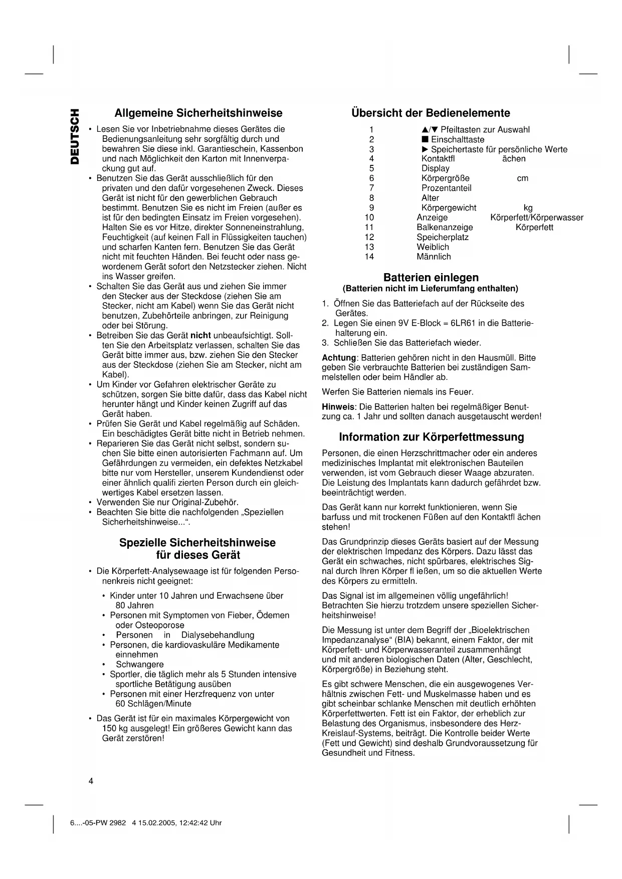 Achtung: Batterien gehören nicht in den Hausmüll. Bitte geben Sie verbrauchte Batterien bei zuständigen Sam- melstellen oder beim Händler ab. Werfen Sie Batterien niemals ins Feuer. Hinweis: Die Batterien halten bei regelmäßiger Benut- zung ca. 1 Jahr und sollten danach ausgetauscht werden! Information zur Körperfettmessung Personen, die einen Herzschrittmacher oder ein anderes medizinisches Implantat mit elektronischen Bauteilen verwenden, ist vom Gebrauch dieser Waage abzuraten. Die Leistung des Implantats kann dadurch gefährdet bzw. beeinträchtigt werden. Das Gerät kann nur korrekt funktionieren, wenn Sie barfuss und mit trockenen Füßen auf den Kontaktfl ächen stehen! Das Grundprinzip dieses Geräts basiert auf der Messung der elektrischen Impedanz des Körpers. Dazu lässt das Gerät ein schwaches, nicht spürbares, elektrisches Sig- nal durch Ihren Körper fl ießen, um so die aktuellen Werte des Körpers zu ermitteln. Das Signal ist im allgemeinen völlig ungefährlich! Betrachten Sie hierzu trotzdem unsere speziellen Sicher- heitshinweise! Die Messung ist unter dem Begriff der „Bioelektrischen Impedanzanalyse“ (BIA) bekannt, einem Faktor, der mit Körperfett- und Körperwasseranteil zusammenhängt und mit anderen biologischen Daten (Alter, Geschlecht, Körpergröße) in Beziehung steht. Es gibt schwere Menschen, die ein ausgewogenes Ver- hältnis zwischen Fett- und Muskelmasse haben und es gibt scheinbar schlanke Menschen mit deutlich erhöhten Körperfettwerten. Fett ist ein Faktor, der erheblich zur Belastung des Organismus, insbesondere des Herz- Kreislauf-Systems, beiträgt. Die Kontrolle beider Werte (Fett und Gewicht) sind deshalb Grundvoraussetzung für Gesundheit und Fitness. 6....-05-PW 2982 4 15.02.2005, 12:42:42 Uhr5 DEUTSCH Körperfett Körperfett ist ein wichtiger Bestandteil des Organismus. Vom Schutz der Gelenke über Vitaminspeicher bis hin zur Reglung der Körpertemperatur übernimmt Fett eine wichtige Aufgabe im Körper. Ziel ist also nicht den Kör- perfettanteil radikal zu reduzieren, sondern ein ausgewo- genes Verhältnis zwischen Muskelmasse und Fettmasse zu erreichen und es zu halten. Die Bedeutung des Wassers für unsere Gesundheit Der menschliche Organismus besteht zu etwa 55-60% aus Wasser, je nach Alter und Geschlecht in unterschied- licher Menge. Wasser hat eine Reihe von Aufgaben im Körper zu erfüllen: