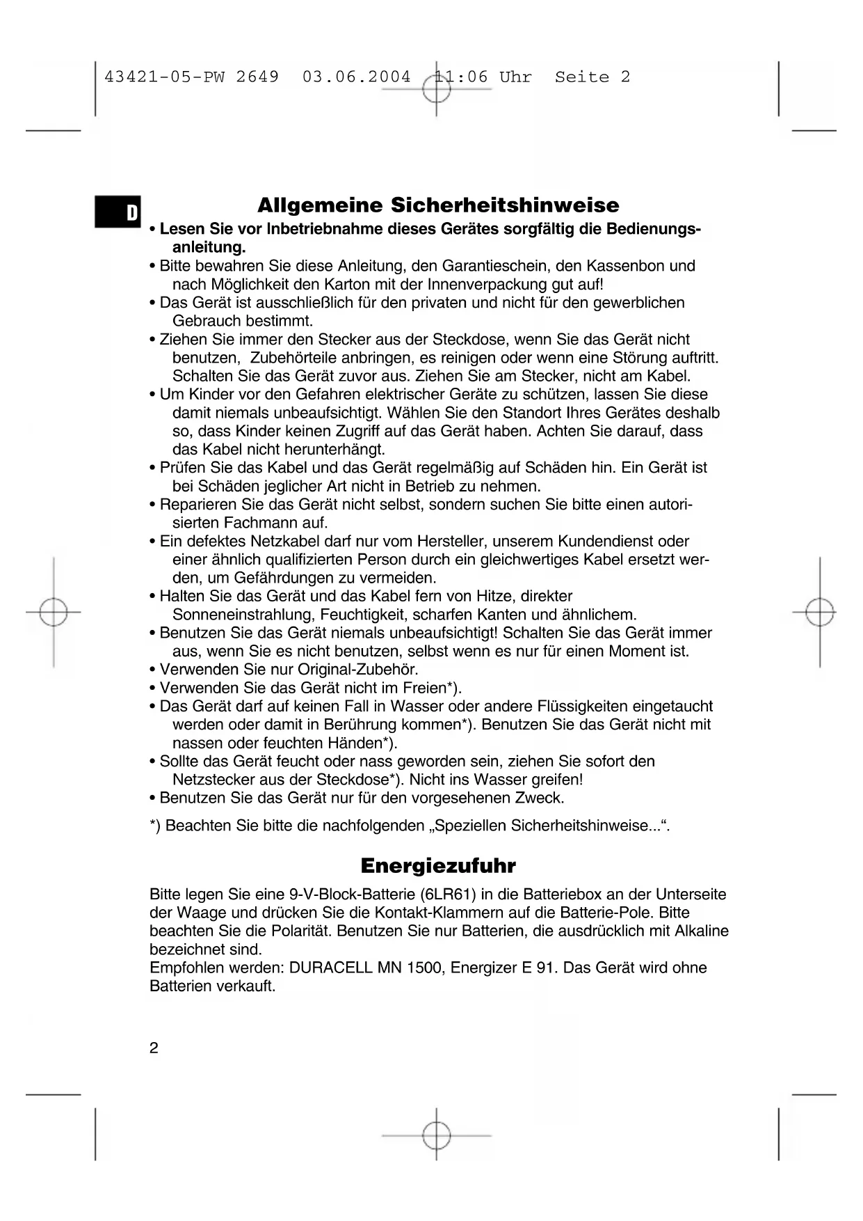 - Benutzen Sie das Gerät nur für den vorgesehenen Zweck. *) Beachten Sie bitte die nachfolgenden „Speziellen Sicherheitshinweise...“. Energiezufuhr Bitte legen Sie eine 9-V-Block-Batterie (6LR61) in die Batteriebox an der Unterseite der Waage und drücken Sie die Kontakt-Klammern auf die Batterie-Pole. Bitte beachten Sie die Polarität. Benutzen Sie nur Batterien, die ausdrücklich mit Alkaline bezeichnet sind. Empfohlen werden: DURACELL MN 1500, Energizer E 91. Das Gerät wird ohne Batterien verkauft.