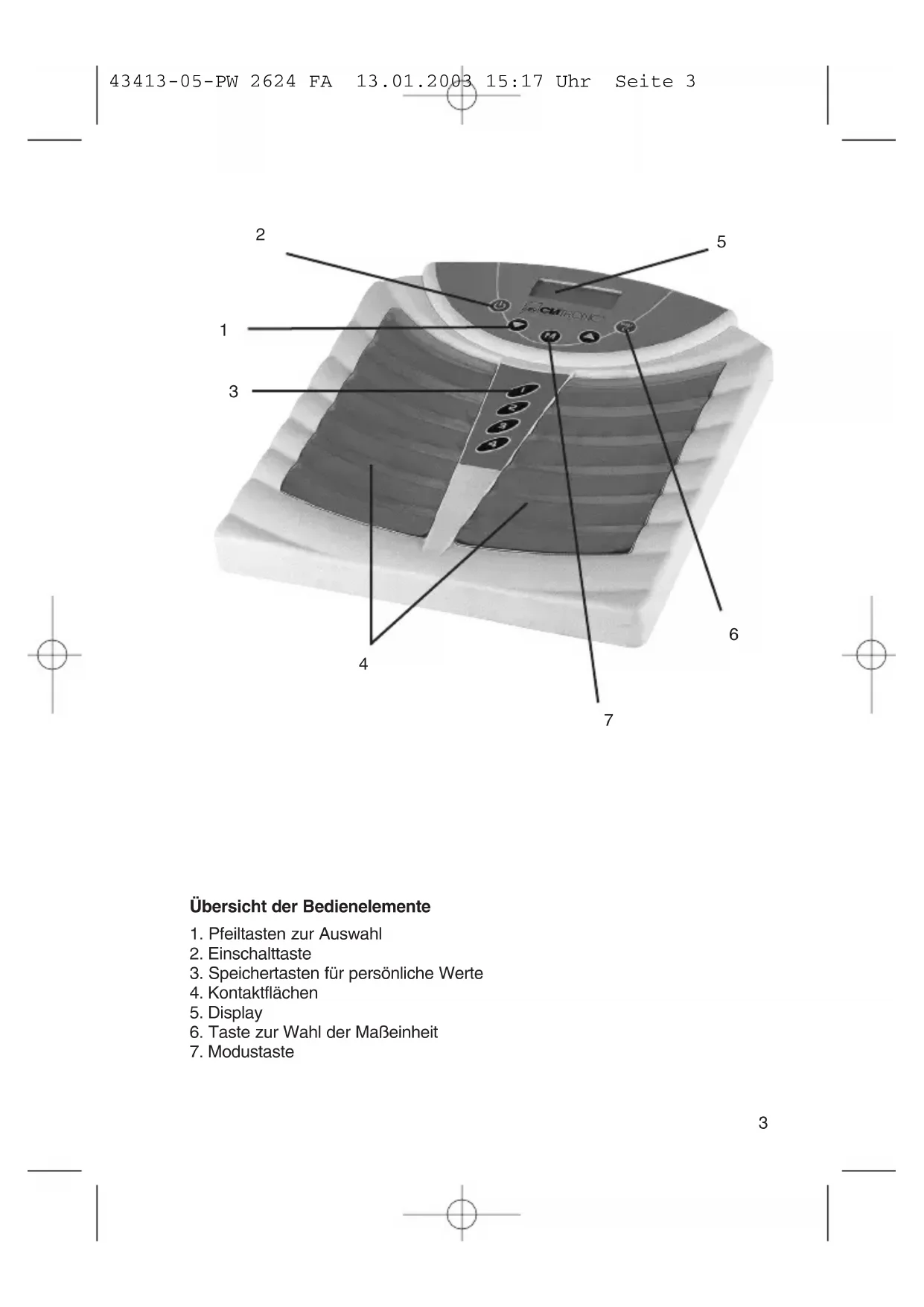RUS 43413-05-PW 2624 FA 13.01.2003 15:17 Uhr Seite 65D-47906 Kempen/Germany · Industriering Ost 40 Internet: http://www.clatronic.de · email: clatronic@t-online.de Technische Daten Modell: PW 2624 FA Spannungsversorgung: 2 x 1,5 V Batterien Typ AA Messgenauigkeit: 40-120 kg + /- 1 kg Obere Messgrenze: 140 kg / 308 lb Untere Messgrenze: 2 kg / 4,4 lb Dieses Gerät entspricht den CE-Richtlinien. Bitte führen Sie das ausgediente Gerät einer umweltgerechten Entsorgung zu. Stünings, Krefeld • 04/01 43413-05-PW 2624 FA 13.01.2003 15:17 Uhr Seite 66