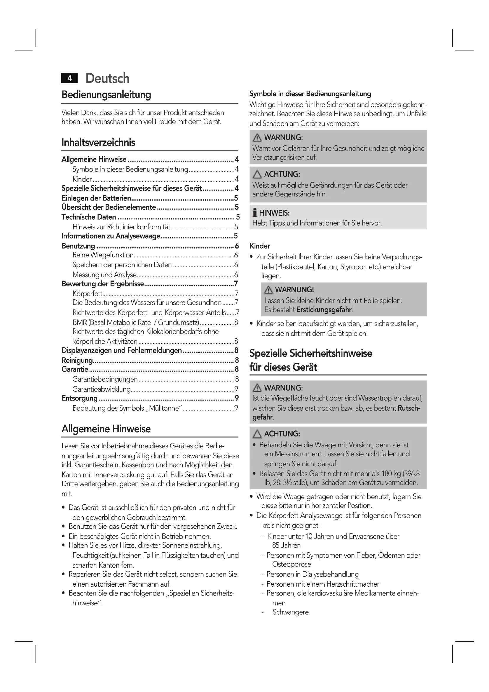 - Die Körperfett-Analysewaage ist für folgenden Personen- kreis nicht geeignet: - Kinder unter 10 Jahren und Erwachsene über 85 Jahren - Personen mit Symptomen von Fieber, Ödemen oder Osteoporose - Personen in Dialysebehandlung - Personen mit einem Herzschrittmacher - Personen, die kardiovaskuläre Medikamente einneh- men - SchwangereDeutsch