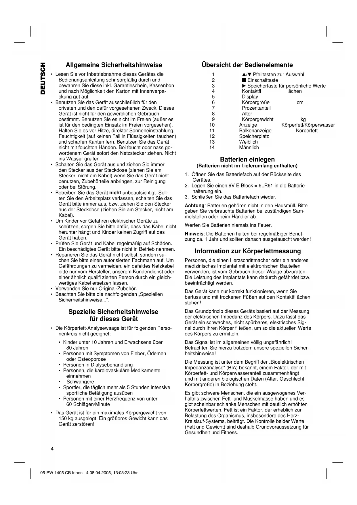 Achtung: Batterien gehören nicht in den Hausmüll. Bitte geben Sie verbrauchte Batterien bei zuständigen Sam- melstellen oder beim Händler ab. Werfen Sie Batterien niemals ins Feuer. Hinweis: Die Batterien halten bei regelmäßiger Benut- zung ca. 1 Jahr und sollten danach ausgetauscht werden! Information zur Körperfettmessung Personen, die einen Herzschrittmacher oder ein anderes medizinisches Implantat mit elektronischen Bauteilen verwenden, ist vom Gebrauch dieser Waage abzuraten. Die Leistung des Implantats kann dadurch gefährdet bzw. beeinträchtigt werden. Das Gerät kann nur korrekt funktionieren, wenn Sie barfuss und mit trockenen Füßen auf den Kontaktfl ächen stehen! Das Grundprinzip dieses Geräts basiert auf der Messung der elektrischen Impedanz des Körpers. Dazu lässt das Gerät ein schwaches, nicht spürbares, elektrisches Sig- nal durch Ihren Körper fl ießen, um so die aktuellen Werte des Körpers zu ermitteln. Das Signal ist im allgemeinen völlig ungefährlich! Betrachten Sie hierzu trotzdem unsere speziellen Sicher- heitshinweise! Die Messung ist unter dem Begriff der „Bioelektrischen Impedanzanalyse“ (BIA) bekannt, einem Faktor, der mit Körperfett- und Körperwasseranteil zusammenhängt und mit anderen biologischen Daten (Alter, Geschlecht, Körpergröße) in Beziehung steht. Es gibt schwere Menschen, die ein ausgewogenes Ver- hältnis zwischen Fett- und Muskelmasse haben und es gibt scheinbar schlanke Menschen mit deutlich erhöhten Körperfettwerten. Fett ist ein Faktor, der erheblich zur Belastung des Organismus, insbesondere des Herz- Kreislauf-Systems, beiträgt. Die Kontrolle beider Werte (Fett und Gewicht) sind deshalb Grundvoraussetzung für Gesundheit und Fitness. 05-PW 1405 CB Innen 4 08.04.2005, 13:03:23 Uhr5 DEUTSCH Körperfett Körperfett ist ein wichtiger Bestandteil des Organismus. Vom Schutz der Gelenke über Vitaminspeicher bis hin zur Reglung der Körpertemperatur übernimmt Fett eine wichtige Aufgabe im Körper. Ziel ist also nicht den Kör- perfettanteil radikal zu reduzieren, sondern ein ausgewo- genes Verhältnis zwischen Muskelmasse und Fettmasse zu erreichen und es zu halten. Die Bedeutung des Wassers für unsere Gesundheit Der menschliche Organismus besteht zu etwa 55-60% aus Wasser, je nach Alter und Geschlecht in unterschied- licher Menge. Wasser hat eine Reihe von Aufgaben im Körper zu erfüllen: