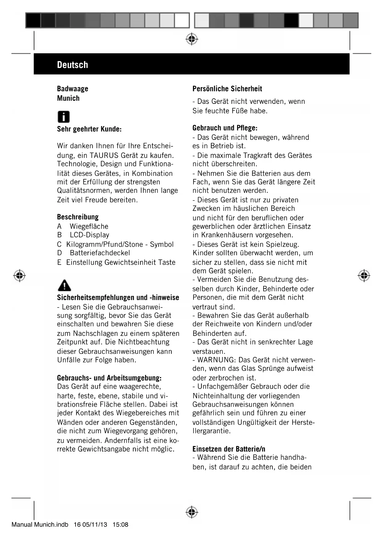 Wir danken Ihnen für ihre Entscheidung, ein TAURUS Gerät zu kaufen. Technologie, Design und Funktionalt aus deses Gerätes, in Kombination mit der Erfüllung der strengsten Qualitätsnormen, werden Ihnen langle Zeit viel Freude bereiten.