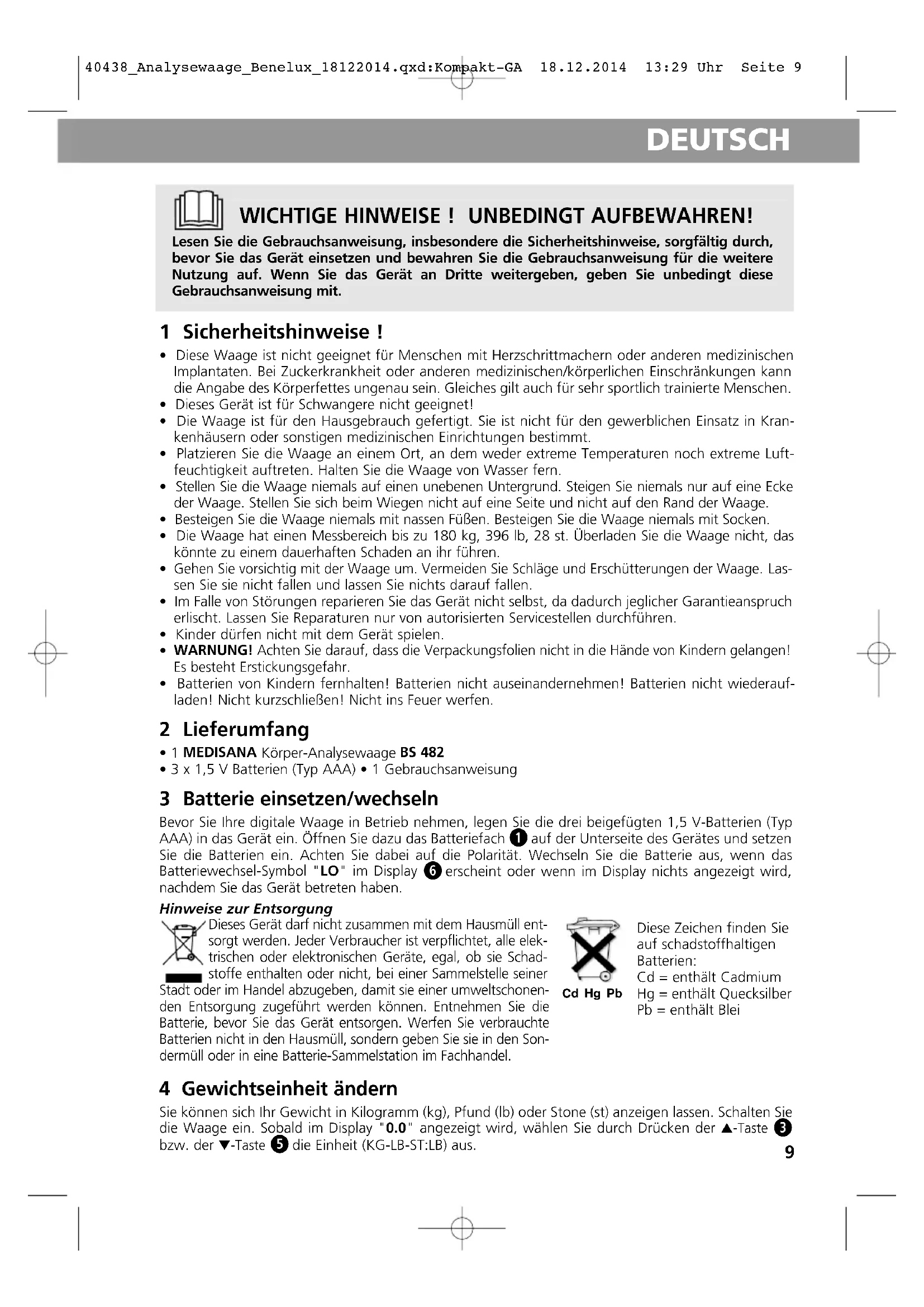 die Einheit (KG-LB-ST:LB) aus. WICHTIGE HINWEISE ! UNBEDINGT AUFBEWAHREN! Lesen Sie die Gebrauchsanweisung, insbesondere die Sicherheitshinweise, sorgfältig durch, bevor Sie das Gerät einsetzen und bewahren Sie die Gebrauchsanweisung für die weitere Nutzung auf. Wenn Sie das Gerät an Dritte weitergeben, geben Sie unbedingt diese Gebrauchsanweisung mit. Diese Zeichen finden Sie auf schadstoffhaltigen Batterien: Cd = enthält Cadmium Hg = enthält Quecksilber Pb = enthält Blei Cd Hg Pb Hinweise zur Entsorgung Dieses Gerät darf nicht zusammen mit dem Hausmüll ent- sorgt werden. Jeder Verbraucher ist verpflichtet, alle elek- trischen oder elektronischen Geräte, egal, ob sie Schad- stoffe enthalten oder nicht, bei einer Sammelstelle seiner Stadt oder im Handel abzugeben, damit sie einer umweltschonen- den Entsorgung zugeführt werden können. Entnehmen Sie die Batterie, bevor Sie das Gerät entsorgen. Werfen Sie verbrauchte Batterien nicht in den Hausmüll, sondern geben Sie sie in den Son- dermüll oder in eine Batterie-Sammelstation im Fachhandel. DEUTSCH