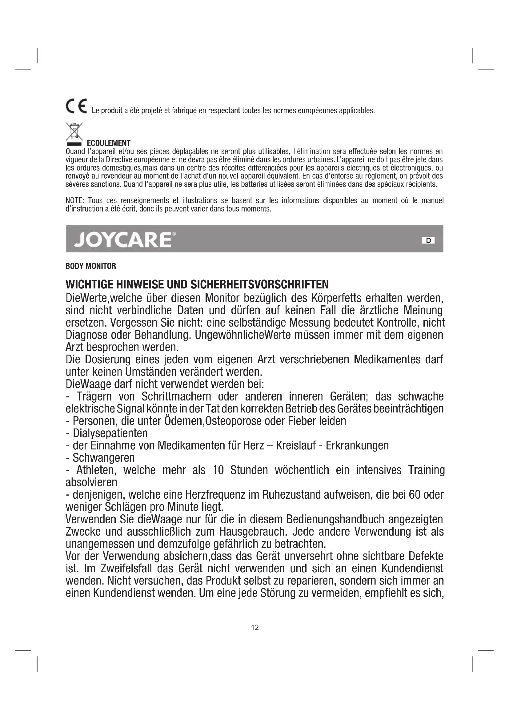 DieWerte,welche über diesen Monitor bezüglich des Körperfetts erhalten werden, sind nicht verbindliche Daten und dürfen auf keinen Fall die ärztliche Meinung ersetzen. Vergessen Sie nicht: eine selbständige Messung bedeutet Kontrolle, nicht Diagnose oder Behandlung. UngewöhnlicheWerte müssen immer mit dem eigenen Arzt besprochen werden. Die Dosierung eines jeden vom eigenen Arzt verschriebenen Medikamentes darf unter keinen Umständen verändert werden. DieWaage darf nicht verwendet werden bei: - Trägern von Schrittmachern oder anderen inneren Geräten; das schwache elektrische Signal könnte in der Tat den korrekten Betrieb des Gerätes beeinträchtigen - Personen, die unter Ödemen,Osteoporose oder Fieber leiden - Dialysepatienten - der Einnahme von Medikamenten für Herz – Kreislauf - Erkrankungen - Schwangeren - Athleten, welche mehr als 10 Stunden wöchentlich ein intensives Training absolvieren - denjenigen, welche eine Herzfrequenz im Ruhezustand aufweisen, die bei 60 oder weniger Schlägen pro Minute liegt. Verwenden Sie dieWaage nur für die in diesem Bedienungshandbuch angezeigten Zwecke und ausschließlich zum Hausgebrauch. Jede andere Verwendung ist als unangemessen und demzufolge gefährlich zu betrachten. Vor der Verwendung absichern,dass das Gerät unversehrt ohne sichtbare Defekte ist. Im Zweifelsfall das Gerät nicht verwenden und sich an einen Kundendienst wenden. Nicht versuchen, das Produkt selbst zu reparieren, sondern sich immer an einen Kundendienst wenden. Um eine jede Störung zu vermeiden, empehlt es sich,12