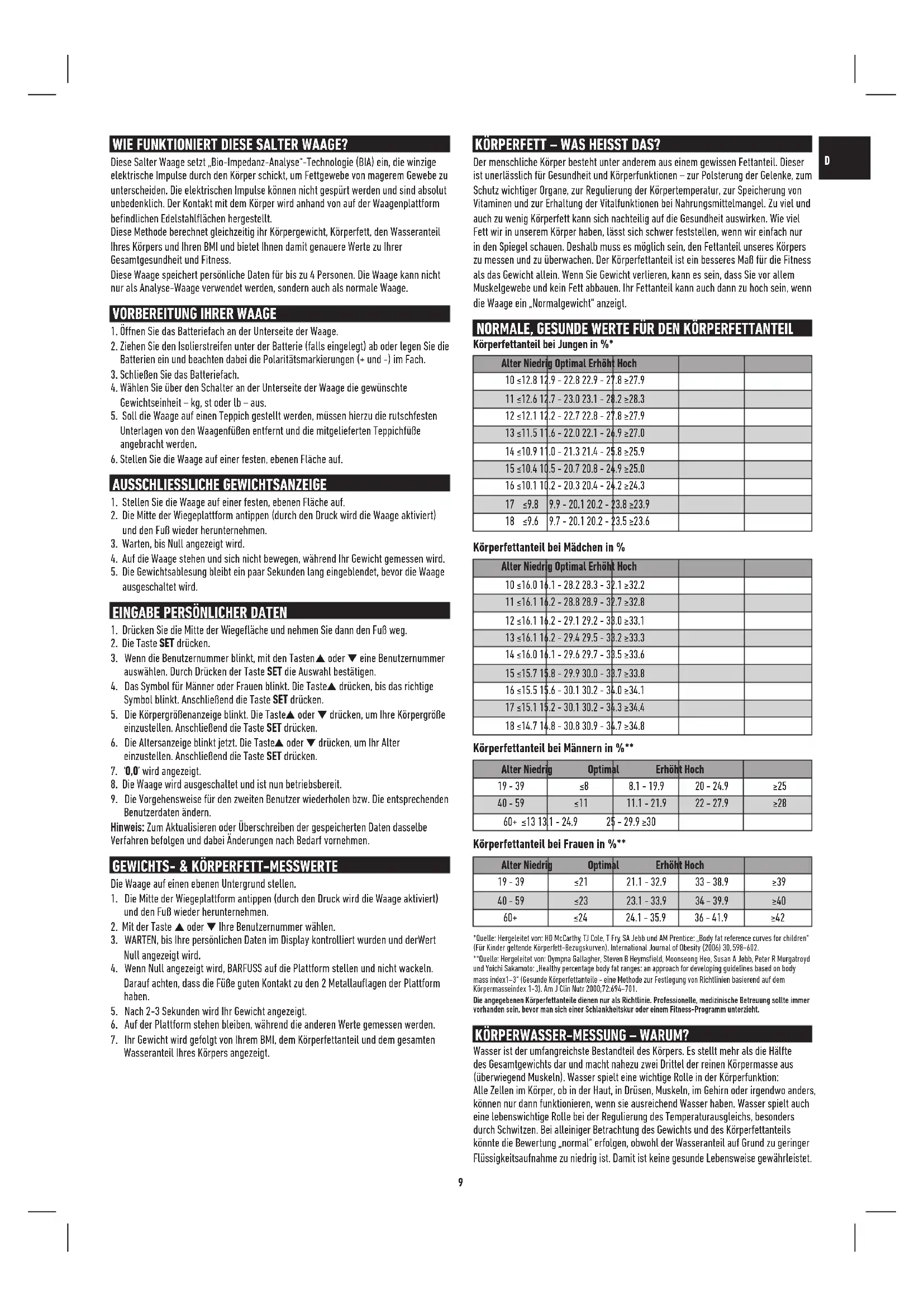 60+ ≤24 24.1 - 35.9 36 - 41.9 ≥42 *Quelle: Hergeleitet von: HD McCarthy, TJ Cole, T Fry, SA Jebb und AM Prentice: „Body fat reference curves for children“ (Für Kinder geltende Körperfett-Bezugskurven). International Journal of Obesity (2006) 30, 598–602. **Quelle: Hergeleitet von: Dympna Gallagher, Steven B Heymsfield, Moonseong Heo, Susan A Jebb, Peter R Murgatroyd und Yoichi Sakamoto: „Healthy percentage body fat ranges: an approach for developing guidelines based on body mass index1–3“ (Gesunde Körperfettanteile - eine Methode zur Festlegung von Richtlinien basierend auf dem Körpermasseindex 1-3). Am J Clin Nutr 2000;72:694–701.Die angegebenen Körperfettanteile dienen nur als Richtlinie. Professionelle, medizinische Betreuung sollte immer vorhanden sein, bevor man sich einer Schlankheitskur oder einem Fitness-Programm unterzieht. KÖRPERWASSER-MESSUNG – WARUM? Wasser ist der umfangreichste Bestandteil des Körpers. Es stellt mehr als die Hälfte des Gesamtgewichts dar und macht nahezu zwei Drittel der reinen Körpermasse aus (überwiegend Muskeln). Wasser spielt eine wichtige Rolle in der Körperfunktion: Alle Zellen im Körper, ob in der Haut, in Drüsen, Muskeln, im Gehirn oder irgendwo anders, können nur dann funktionieren, wenn sie ausreichend Wasser haben. Wasser spielt auch eine lebenswichtige Rolle bei der Regulierung des Temperaturausgleichs, besonders durch Schwitzen. Bei alleiniger Betrachtung des Gewichts und des Körperfettanteils könnte die Bewertung „normal“ erfolgen, obwohl der Wasseranteil auf Grund zu geringer Flüssigkeitsaufnahme zu niedrig ist. Damit ist keine gesunde Lebensweise gewährleistet.10