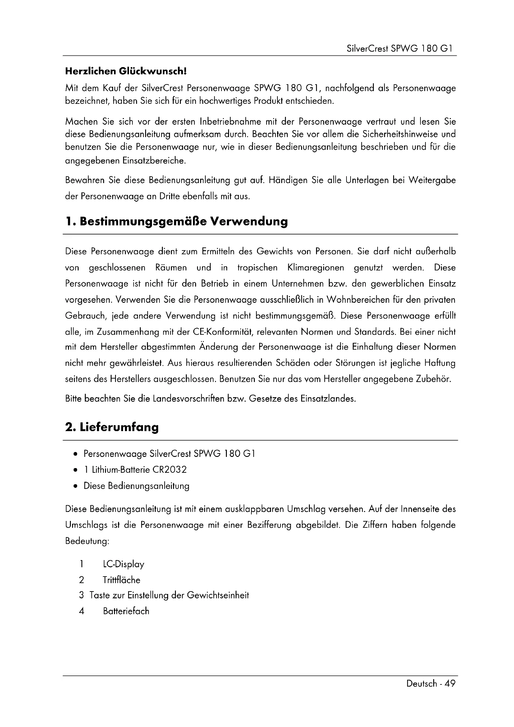Personenwaage SilverCrest SPWG 180 G1 1 Lithium-Batterie CR2032 Diese Bedienungsanleitung Diese Bedienungsanleitung ist mit einem ausklappbaren Umschlag versehen. Auf der Innenseite des Umschlags ist die Personenwaage mit einer Bezifferung abgebildet. Die Ziffern haben folgende Bedeutung: 1 LC-Display 2 Trittfläche 3 Taste zur Einstellung der Gewichtseinheit 4 BatteriefachSilverCrest SPWG 180 G1