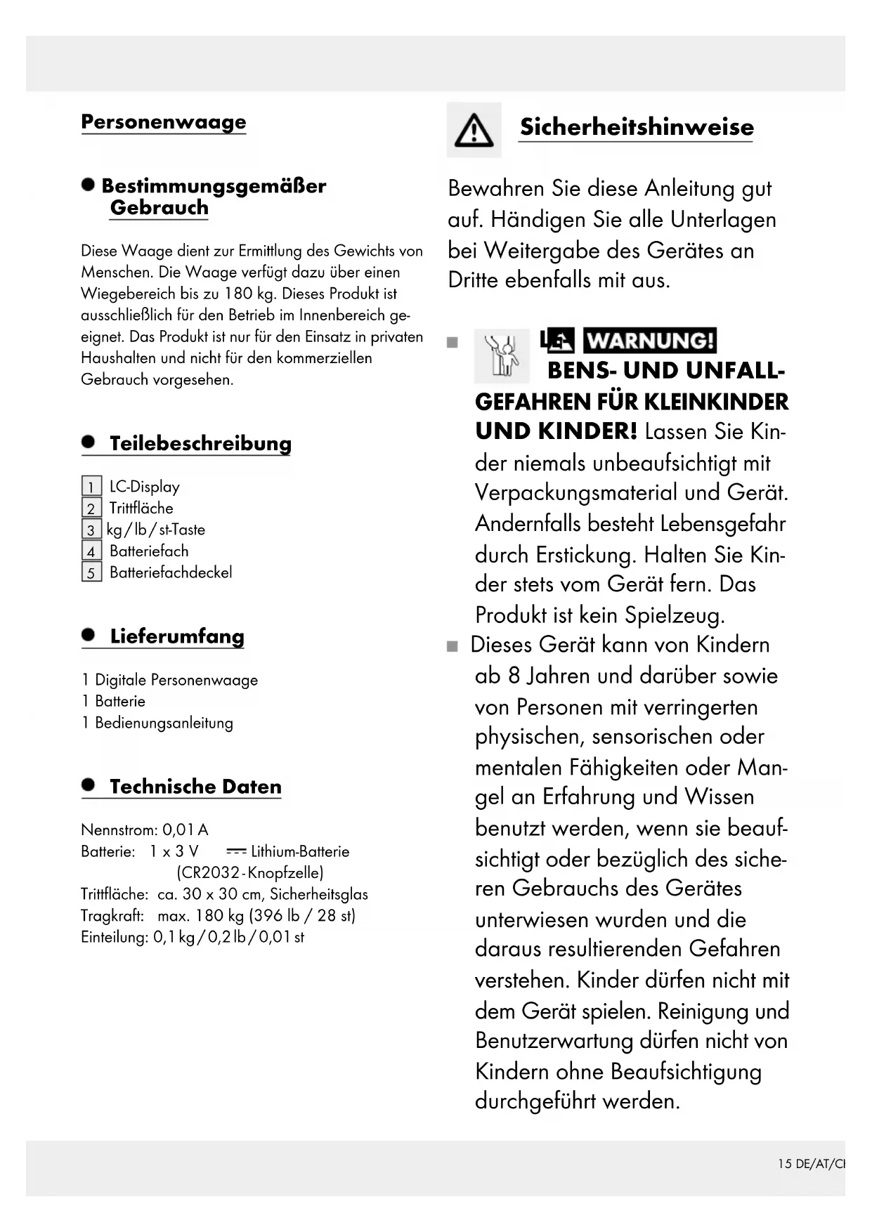UND KINDER! Lassen Sie Kin- der niemals unbeaufsichtigt mit Verpackungsmaterial und Gerät. Andernfalls besteht Lebensgefahr durch Erstickung. Halten Sie Kin- der stets vom Gerät fern. Das Produkt ist kein Spielzeug. Dieses Gerät kann von Kindern ab 8 Jahren und darüber sowie von Personen mit verringerten physischen, sensorischen oder mentalen Fähigkeiten oder Man- gel an Erfahrung und Wissen benutzt werden, wenn sie beauf- sichtigt oder bezüglich des siche- ren Gebrauchs des Gerätes unterwiesen wurden und die daraus resultierenden Gefahren verstehen. Kinder dürfen nicht mit dem Gerät spielen. Reinigung und Benutzerwartung dürfen nicht von Kindern ohne Beaufsichtigung durchgeführt werden.16 DE/AT/CH Max. 180 kg VORSICHT! VERLET- ZUNGSGEFAHR! Belasten Sie die Waage nicht über 180 kg. Das Sicherheitsglas könnte brechen und Schnittverlet- zungen verursachen. VORSICHT! VERLET- ZUNGSGEFAHR! Betreten Sie die Waage nicht mit nassen Füßen und nutzen Sie die Waage nicht, wenn die Tritt- fläche feucht ist. Andernfalls kön- nen Sie ausrutschen. Schützen Sie die Waage vor Stößen, Feuchtigkeit, Staub, Chemikalien, starken Temperatur- schwankungen und zu nahen Wärmequellen (Öfen, Heizungs- körper). Kontrollieren Sie das Gerät vor der Inbetriebnahme auf Beschä- digungen. Nehmen Sie ein beschädigtes Gerät nicht in Betrieb. Entfernen Sie bei Störungen oder defektem Gerät die Batterie. Andernfalls besteht erhöhte Auslaufgefahr. Lassen Sie Reparaturen nur von der Servicestelle oder einer Elektrofachkraft durchführen. Gefahren im Umgang mit Batterien LEBENSGE- FAHR! Batterien gehören nicht in Kinderhände. Lassen Sie Bat- terien nicht herumliegen. Es be- steht die Gefahr, dass diese von Kindern oder Haustieren ver- schluckt werden. Suchen Sie im Falle eines Verschluckens sofort einen Arzt auf.