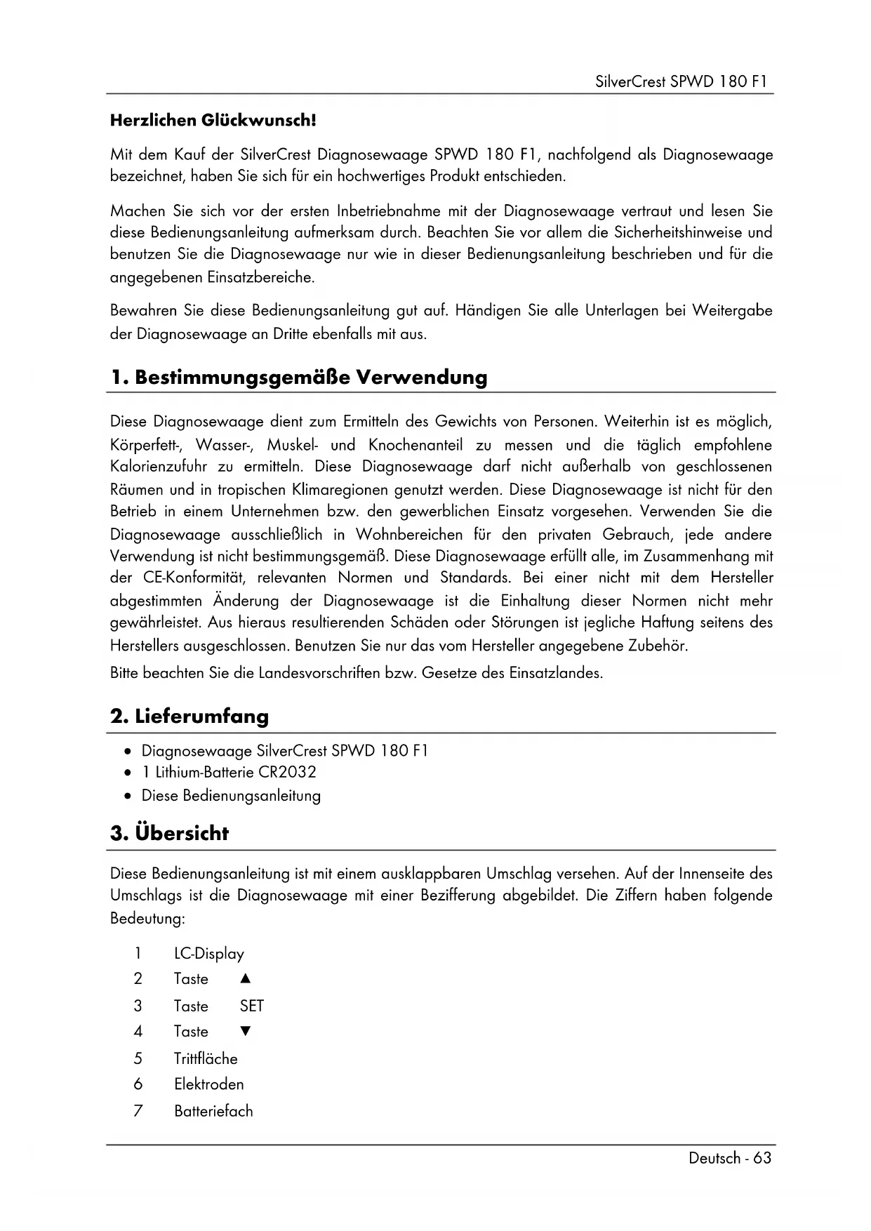 Diese Bedienungsanleitung ist mit einem ausklappbaren Umschlag versehen. Auf der Innenseite des Umschlags ist die Diagnosewaage mit einer Bezifferung abgebildet. Die Ziffern haben folgende Bedeutung: 1 LC-Display 2 Taste ▲ 3 Taste SET 4 Taste ▼ 5 Trittfläche 6 Elektroden 7 BatteriefachSilverCrest SPWD 180 F1