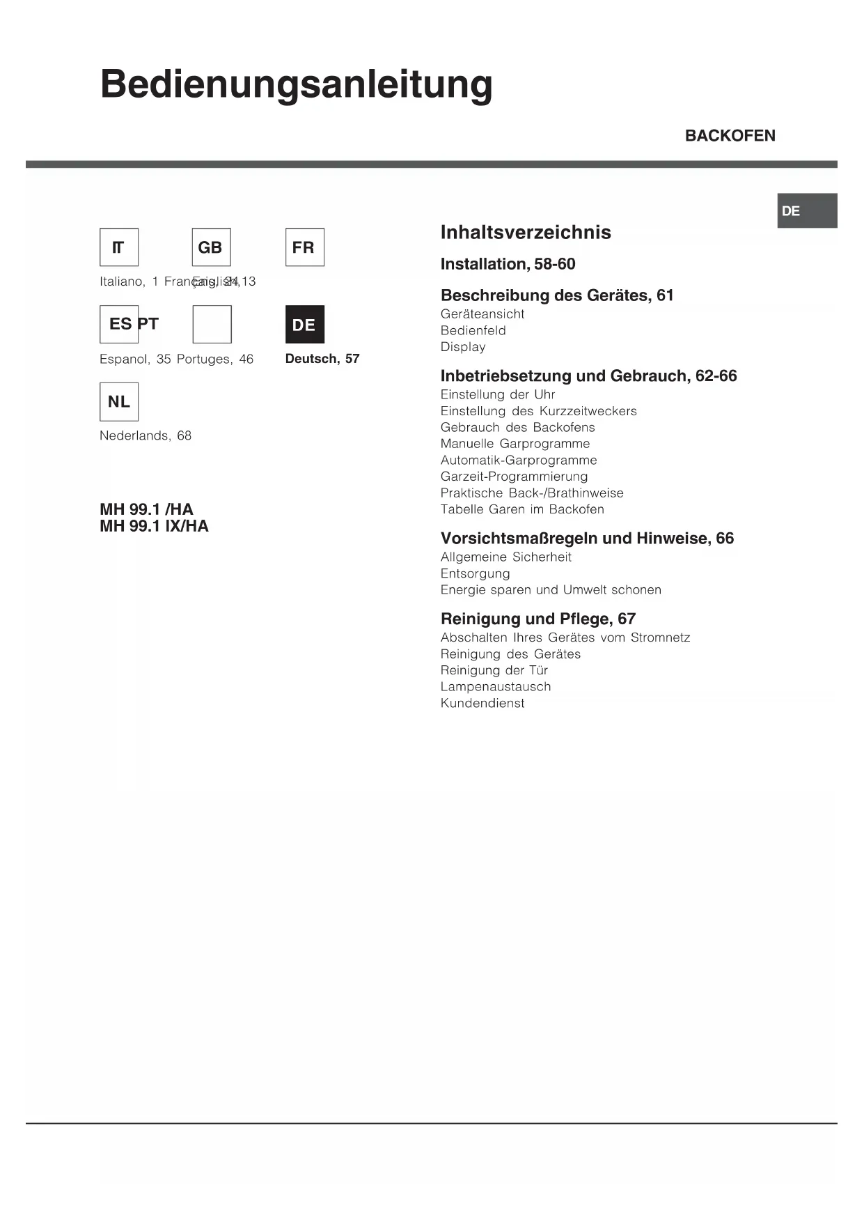- o número de série (S/N); Estas últimas informações encontram-se na placa de identificação situada no aparelho. Manutenção e cuidadosDE BACKOFEN MH 99.1 /HA MH 99.1 IX/HA Bedienungsanleitung Inhaltsverzeichnis Installation, 58-60 Beschreibung des Gerätes, 61 Geräteansicht Bedienfeld Display Inbetriebsetzung und Gebrauch, 62-66 Einstellung der Uhr Einstellung des Kurzzeitweckers Gebrauch des Backofens Manuelle Garprogramme Automatik-Garprogramme Garzeit-Programmierung Praktische Back-/Brathinweise Tabelle Garen im Backofen Vorsichtsmaßregeln und Hinweise, 66 Allgemeine Sicherheit Entsorgung Energie sparen und Umwelt schonen Reinigung und Pflege, 67 Abschalten Ihres Gerätes vom Stromnetz Reinigung des Gerätes Reinigung der Tür Lampenaustausch Kundendienst Italiano, 1 Français, 24 Espanol, 35 Portuges, 46 English,13