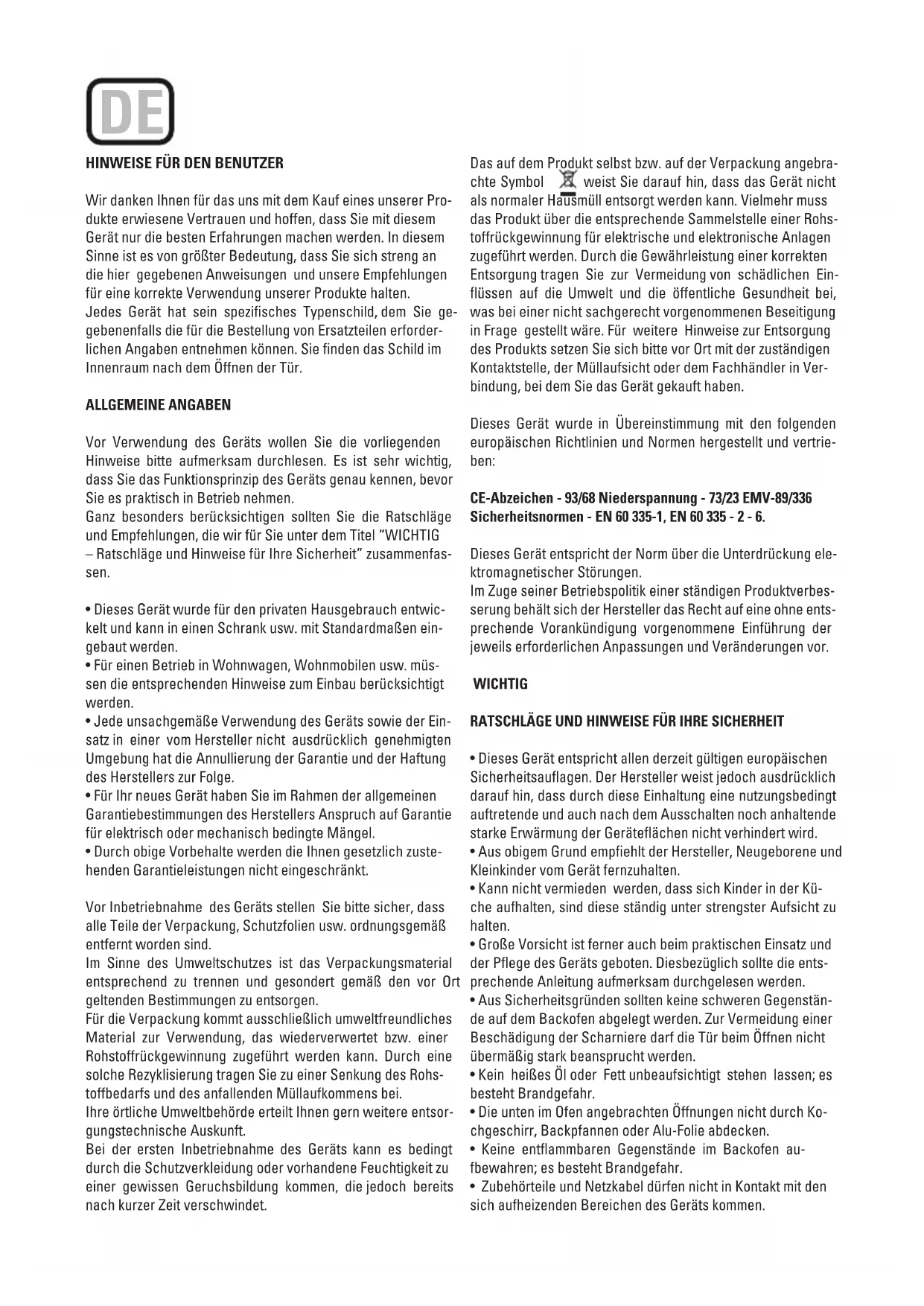 Dieses Gerät ist ausschließlich für den Hausbedarf bestimmt. Backofen nur zur Zubereitung von Speisen verwenden.