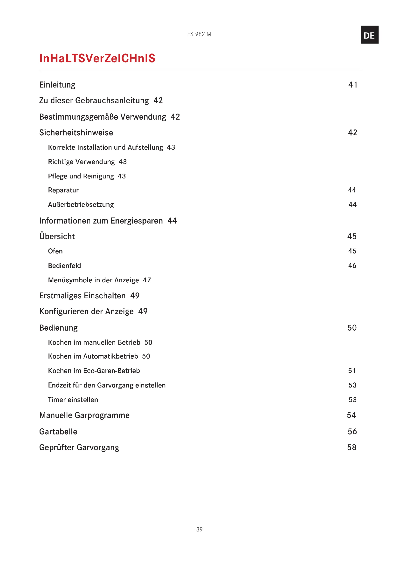 InhalTsverzeIChnIs Einleitung 41 Zu dieser Gebrauchsanleitung 42 Bestimmungsgemäße Verwendung 42 Sicherheitshinweise 42 Korrekte Installation und Aufstellung 43 Richtige Verwendung 43 Pflege und Reinigung 43 Reparatur 44 Außerbetriebsetzung 44 Informationen zum Energiesparen 44 Übersicht 45 Ofen 45 Bedienfeld 46 Menüsymbole in der Anzeige 47 Erstmaliges Einschalten 49 Konfigurieren der Anzeige 49 Bedienung 50 Kochen im manuellen Betrieb 50 Kochen im Automatikbetrieb 50 Kochen im Eco-Garen-Betrieb 51 Endzeit für den Garvorgang einstellen 53 Timer einstellen 53 Manuelle Garprogramme 54 Gartabelle 56 Geprüfter Garvorgang 58– 40 – FS 982 M