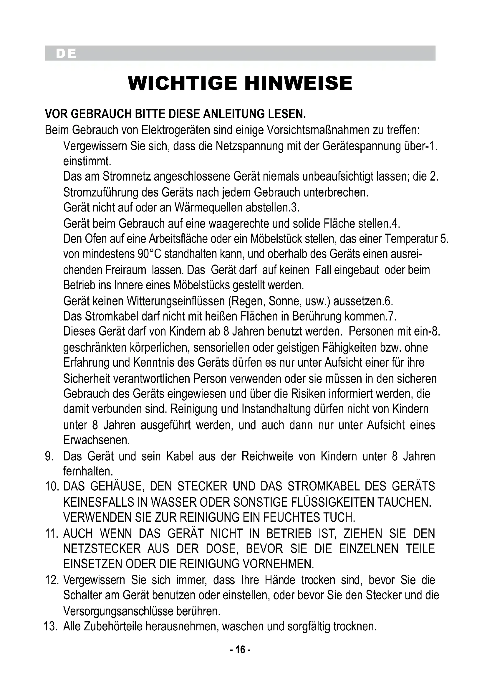WICHTIGE HINWEISE VoR GEBRAUCh BITTE DIESE ANLEITUNG LESEN. Beim Gebrauch von Elektrogeräten sind einige Vorsichtsmaßnahmen zu treffen: Vergewissern Sie sich, dass die Netzspannung mit der Gerätespannung über-1. einstimmt. Das am Stromnetz angeschlossene Gerät niemals unbeaufsichtigt lassen; die 2. Stromzuführung des Geräts nach jedem Gebrauch unterbrechen. Gerät nicht auf oder an Wärmequellen abstellen.3. Gerät beim Gebrauch auf eine waagerechte und solide Fläche stellen.4. Den Ofen auf eine Arbeitsfläche oder ein Möbelstück stellen, das einer Temperatur 5. von mindestens 90°C standhalten kann, und oberhalb des Geräts einen ausrei- chenden Freiraum lassen. Das Gerät darf auf keinen Fall eingebaut oder beim Betrieb ins Innere eines Möbelstücks gestellt werden. Gerät keinen Witterungseinflüssen (Regen, Sonne, usw.) aussetzen.6. Das Stromkabel darf nicht mit heißen Flächen in Berührung kommen.7. Dieses Gerät darf von Kindern ab 8 Jahren benutzt werden. Personen mit ein-8. geschränkten körperlichen, sensoriellen oder geistigen Fähigkeiten bzw. ohne Erfahrung und Kenntnis des Geräts dürfen es nur unter Aufsicht einer für ihre Sicherheit verantwortlichen Person verwenden oder sie müssen in den sicheren Gebrauch des Geräts eingewiesen und über die Risiken informiert werden, die damit verbunden sind. Reinigung und Instandhaltung dürfen nicht von Kindern unter 8 Jahren ausgeführt werden, und auch dann nur unter Aufsicht eines Erwachsenen. Das Gerät und sein Kabel aus der Reichweite von Kindern unter 8 Jahren 9. fernhalten. DAS GEHÄUSE, DEN STECKER UND DAS STROMKABEL DES GERÄTS 10. KEINESFALLS IN WASSER ODER SONSTIGE FLÜSSIGKEITEN TAUCHEN. VERWENDEN SIE ZUR REINIGUNG EIN FEUCHTES TUCH. AUCH WENN DAS GERÄT NICHT IN BETRIEB IST, ZIEHEN SIE DEN 11. NETZSTECKER AUS DER DOSE, BEVOR SIE DIE EINZELNEN TEILE EINSETZEN ODER DIE REINIGUNG VORNEHMEN. Vergewissern Sie sich immer, dass Ihre Hände trocken sind, bevor Sie die 12. Schalter am Gerät benutzen oder einstellen, oder bevor Sie den Stecker und die Versorgungsanschlüsse berühren. Alle Zubehörteile herausnehmen, waschen und sorgfältig trocknen.13.DE