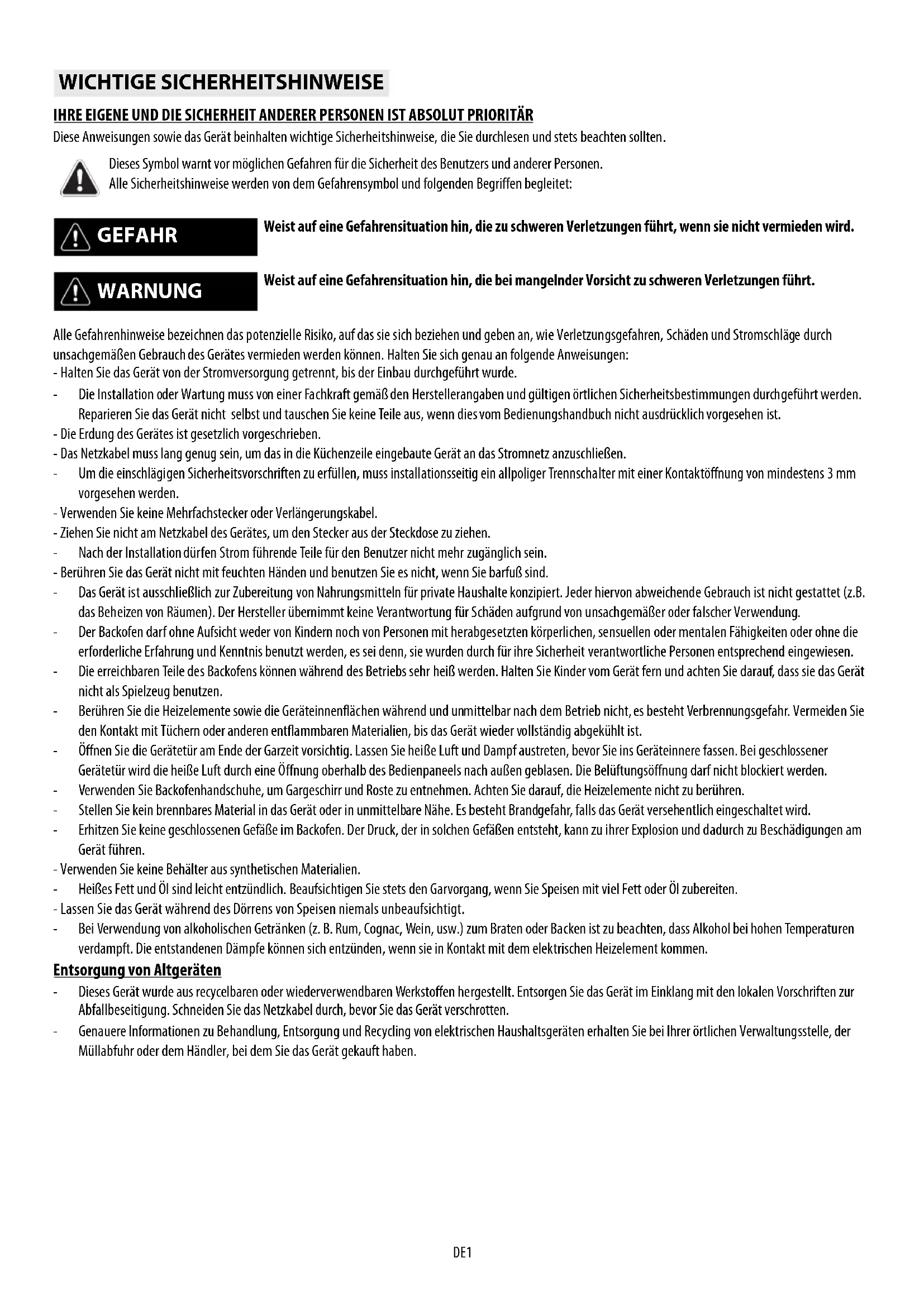SRDE1 IHRE EIGENE UND DIE SICHERHEIT ANDERER PERSONEN IST ABSOLUT PRIORITÄR Diese Anweisungen sowie das Gerät beinhalten wichtige Sicherheitshinweise, die Sie durchlesen und stets beachten sollten. Alle Gefahrenhinweise bezeichnen das potenzielle Risiko, auf das sie sich beziehen und geben an, wie Verletzungsgefahren, Schäden und Stromschläge durch unsachgemäßen Gebrauch des Gerätes vermieden werden können. Halten Sie sich genau an folgende Anweisungen: - Halten Sie das Gerät von der Stromversorgung getrennt, bis der Einbau durchgeführt wurde. - Die Installation oder Wartung muss von einer Fachkraft gemäß den Herstellerangaben und gültigen örtlichen Sicherheitsbestimmungen durchgeführt werden. Reparieren Sie das Gerät nicht selbst und tauschen Sie keine Teile aus, wenn dies vom Bedienungshandbuch nicht ausdrücklich vorgesehen ist. - Die Erdung des Gerätes ist gesetzlich vorgeschrieben. - Das Netzkabel muss lang genug sein, um das in die Küchenzeile eingebaute Gerät an das Stromnetz anzuschließen. - Um die einschlägigen Sicherheitsvorschriften zu erfüllen, muss installationsseitig ein allpoliger Trennschalter mit einer Kontaktöffnung von mindestens 3 mm vorgesehen werden. - Verwenden Sie keine Mehrfachstecker oder Verlängerungskabel. - Ziehen Sie nicht am Netzkabel des Gerätes, um den Stecker aus der Steckdose zu ziehen. - Nach der Installation dürfen Strom führende Teile für den Benutzer nicht mehr zugänglich sein. - Berühren Sie das Gerät nicht mit feuchten Händen und benutzen Sie es nicht, wenn Sie barfuß sind. - Das Gerät ist ausschließlich zur Zubereitung von Nahrungsmitteln für private Haushalte konzipiert. Jeder hiervon abweichende Gebrauch ist nicht gestattet (z.B. das Beheizen von Räumen). Der Hersteller übernimmt keine Verantwortung für Schäden aufgrund von unsachgemäßer oder falscher Verwendung. - Der Backofen darf ohne Aufsicht weder von Kindern noch von Personen mit herabgesetzten körperlichen, sensuellen oder mentalen Fähigkeiten oder ohne die erforderliche Erfahrung und Kenntnis benutzt werden, es sei denn, sie wurden durch für ihre Sicherheit verantwortliche Personen entsprechend eingewiesen. - Die erreichbaren Teile des Backofens können während des Betriebs sehr heiß werden. Halten Sie Kinder vom Gerät fern und achten Sie darauf, dass sie das Gerät nicht als Spielzeug benutzen. - Berühren Sie die Heizelemente sowie die Geräteinnenflächen während und unmittelbar nach dem Betrieb nicht, es besteht Verbrennungsgefahr. Vermeiden Sie den Kontakt mit Tüchern oder anderen entflammbaren Materialien, bis das Gerät wieder vollständig abgekühlt ist. - Öffnen Sie die Gerätetür am Ende der Garzeit vorsichtig. Lassen Sie heiße Luft und Dampf austreten, bevor Sie ins Geräteinnere fassen. Bei geschlossener Gerätetür wird die heiße Luft durch eine Öffnung oberhalb des Bedienpaneels nach außen geblasen. Die Belüftungsöffnung darf nicht blockiert werden. - Verwenden Sie Backofenhandschuhe, um Gargeschirr und Roste zu entnehmen. Achten Sie darauf, die Heizelemente nicht zu berühren. - Stellen Sie kein brennbares Material in das Gerät oder in unmittelbare Nähe. Es besteht Brandgefahr, falls das Gerät versehentlich eingeschaltet wird. - Erhitzen Sie keine geschlossenen Gefäße im Backofen. Der Druck, der in solchen Gefäßen entsteht, kann zu ihrer Explosion und dadurch zu Beschädigungen am Gerät führen. - Verwenden Sie keine Behälter aus synthetischen Materialien. - Heißes Fett und Öl sind leicht entzündlich. Beaufsichtigen Sie stets den Garvorgang, wenn Sie Speisen mit viel Fett oder Öl zubereiten. - Lassen Sie das Gerät während des Dörrens von Speisen niemals unbeaufsichtigt. - Bei Verwendung von alkoholischen Getränken (z. B. Rum, Cognac, Wein, usw.) zum Braten oder Backen ist zu beachten, dass Alkohol bei hohen Temperaturen verdampft. Die entstandenen Dämpfe können sich entzünden, wenn sie in Kontakt mit dem elektrischen Heizelement kommen. Entsorgung von Altgeräten - Dieses Gerät wurde aus recycelbaren oder wiederverwendbaren Werkstoffen hergestellt. Entsorgen Sie das Gerät im Einklang mit den lokalen Vorschriften zur Abfallbeseitigung. Schneiden Sie das Netzkabel durch, bevor Sie das Gerät verschrotten. - Genauere Informationen zu Behandlung, Entsorgung und Recycling von elektrischen Haushaltsgeräten erhalten Sie bei Ihrer örtlichen Verwaltungsstelle, der Müllabfuhr oder dem Händler, bei dem Sie das Gerät gekauft haben. WICHTIGE SICHERHEITSHINWEISE Dieses Symbol warnt vor möglichen Gefahren für die Sicherheit des Benutzers und anderer Personen. Alle Sicherheitshinweise werden von dem Gefahrensymbol und folgenden Begriffen begleitet: GEFAHR Weist auf eine Gefahrensituation hin, die zu schweren Verletzungen führt, wenn sie nicht vermieden wird. WARNUNG Weist auf eine Gefahrensituation hin, die bei mangelnder Vorsicht zu schweren Verletzungen führt.DE2 Prüfen Sie nach dem Auspacken, dass das Gerät keine Transportschäden aufweist und die Backofentür richtig schließt. Bei auftretenden Problemen wenden Sie sich bitte an Ihren Händler oder rufen die nächste Kundendienststelle an. Um eventuellen Schäden vorzubeugen, sollten Sie das Gerät erst unmittelbar vor der Installation von der Polystyrolunterlage nehmen.