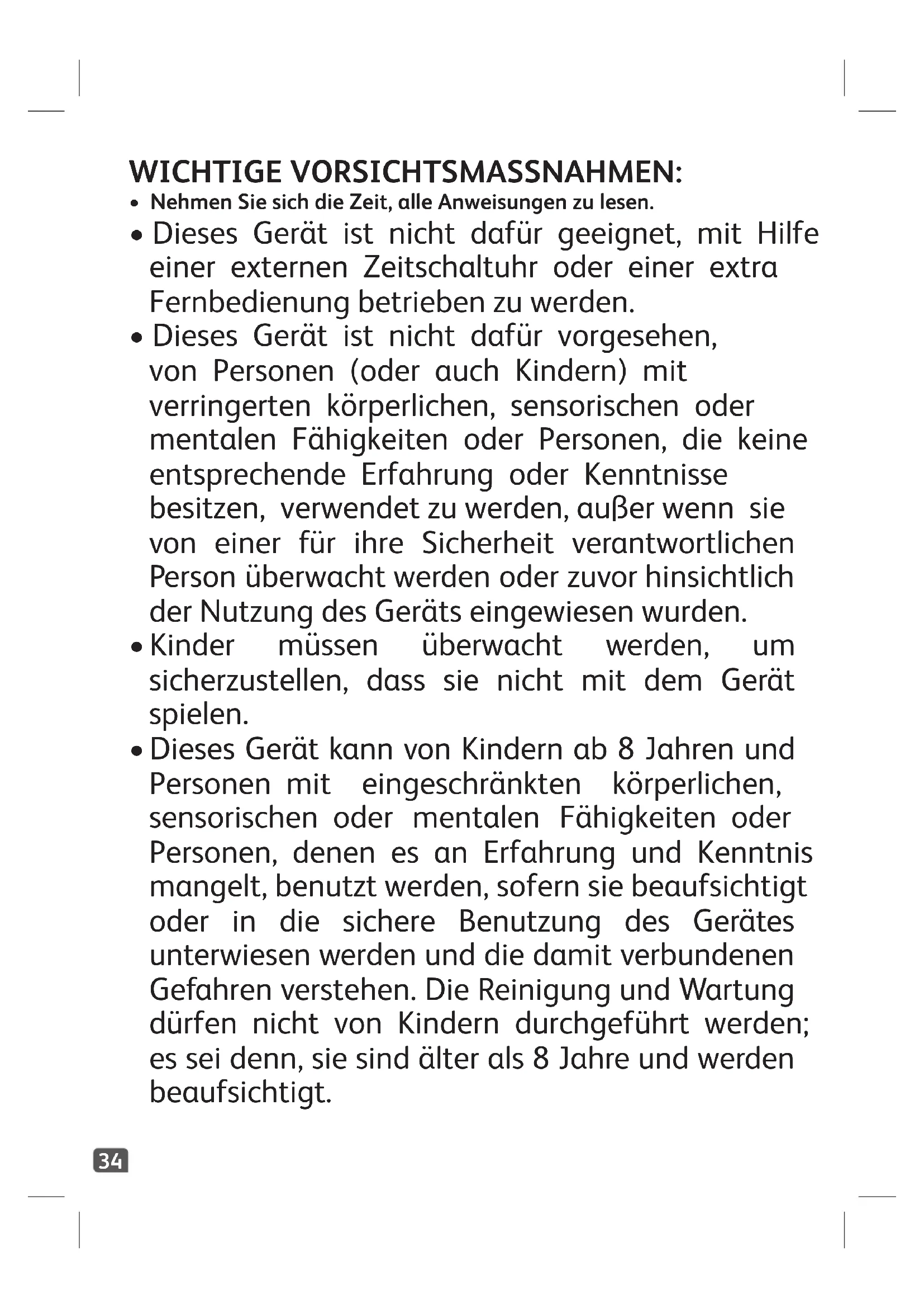 - Dieses Gerät kann von Kindern ab 8 Jahren und Personen mit eingeschränkten körperlichen, sensorischen oder mentalen Fähigkeiten oder Personen, denen es an Erfahrung und Kenntnis mangelt, benutzt werden, sofern sie beaufsichtigt oder in die sichere Benutzung des Gerätes unterwiesen werden und die damit verbundenen Gefahren verstehen. Die Reinigung und Wartung dürfen nicht von Kindern durchgeführt werden; es sei denn, sie sind älter als 8 Jahre und werden beaufsichtigt.35