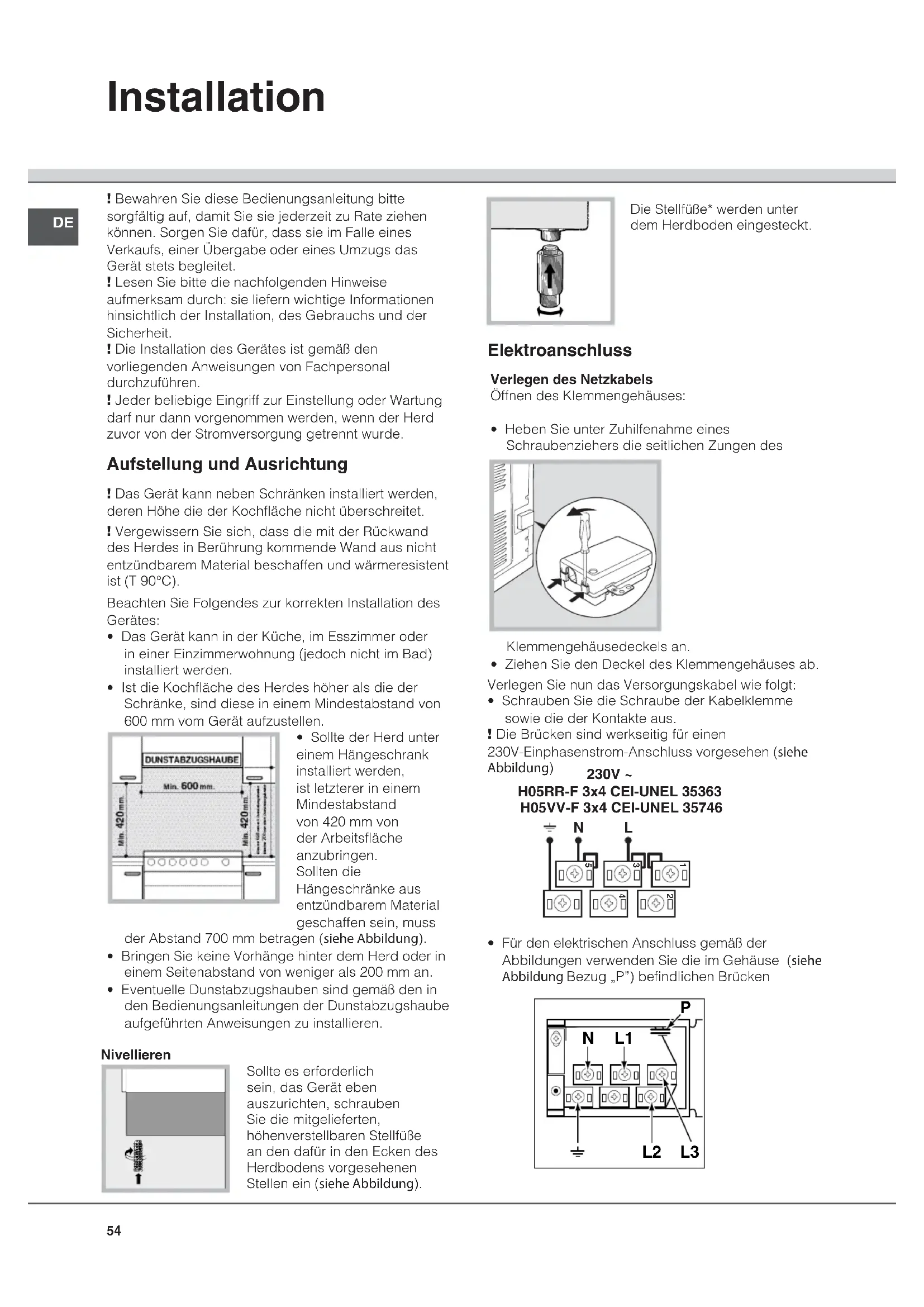 ! Bewahren Sie diese Bedienungsanleitung bitte sorgfältig auf, damit Sie sie jederzeit zu Rate ziehen können. Sorgen Sie dafür, dass sie im Falle eines Verkaufs, einer Übergabe oder eines Umzugs das Gerät stets begleitet.! Lesen Sie bitte die nachfolgenden Hinweise aufmerksam durch: sie liefern wichtige Informationen hinsichtlich der Installation, des Gebrauchs und der Sicherheit.! Die Installation des Gerätes ist gemäß den vorliegenden Anweisungen von Fachpersonal durchzuführen. ! Jeder beliebige Eingriff zur Einstellung oder Wartung darf nur dann vorgenommen werden, wenn der Herd zuvor von der Stromversorgung getrennt wurde. Aufstellung und Ausrichtung ! Das Gerät kann neben Schränken installiert werden, deren Höhe die der Kochfläche nicht überschreitet. ! Vergewissern Sie sich, dass die mit der Rückwand des Herdes in Berührung kommende Wand aus nicht entzündbarem Material beschaffen und wärmeresistent ist (T 90°C). Beachten Sie Folgendes zur korrekten Installation des Gerätes:• Das Gerät kann in der Küche, im Esszimmer oder in einer Einzimmerwohnung (jedoch nicht im Bad) installiert werden. • Ist die Kochfläche des Herdes höher als die der Schränke, sind diese in einem Mindestabstand von 600 mm vom Gerät aufzustellen.• Sollte der Herd unter einem Hängeschrank installiert werden, ist letzterer in einem Mindestabstand von 420 mm von der Arbeitsfläche anzubringen.Sollten die Hängeschränke aus entzündbarem Material geschaffen sein, muss der Abstand 700 mm betragen (siehe Abbildung). • Bringen Sie keine Vorhänge hinter dem Herd oder in einem Seitenabstand von weniger als 200 mm an. • Eventuelle Dunstabzugshauben sind gemäß den in den Bedienungsanleitungen der Dunstabzugshaube aufgeführten Anweisungen zu installieren. NivellierenSollte es erforderlich sein, das Gerät eben auszurichten, schrauben Sie die mitgelieferten, höhenverstellbaren Stellfüße an den dafür in den Ecken des Herdbodens vorgesehenen Stellen ein (siehe Abbildung).Die Stellfüße* werden unter dem Herdboden eingesteckt. Elektroanschluss Verlegen des NetzkabelsÖffnen des Klemmengehäuses:• Heben Sie unter Zuhilfenahme eines Schraubenziehers die seitlichen Zungen des Klemmengehäusedeckels an.• Ziehen Sie den Deckel des Klemmengehäuses ab.Verlegen Sie nun das Versorgungskabel wie folgt:• Schrauben Sie die Schraube der Kabelklemme sowie die der Kontakte aus.! Die Brücken sind werkseitig für einen 230V-Einphasenstrom-Anschluss vorgesehen (siehe Abbildung)