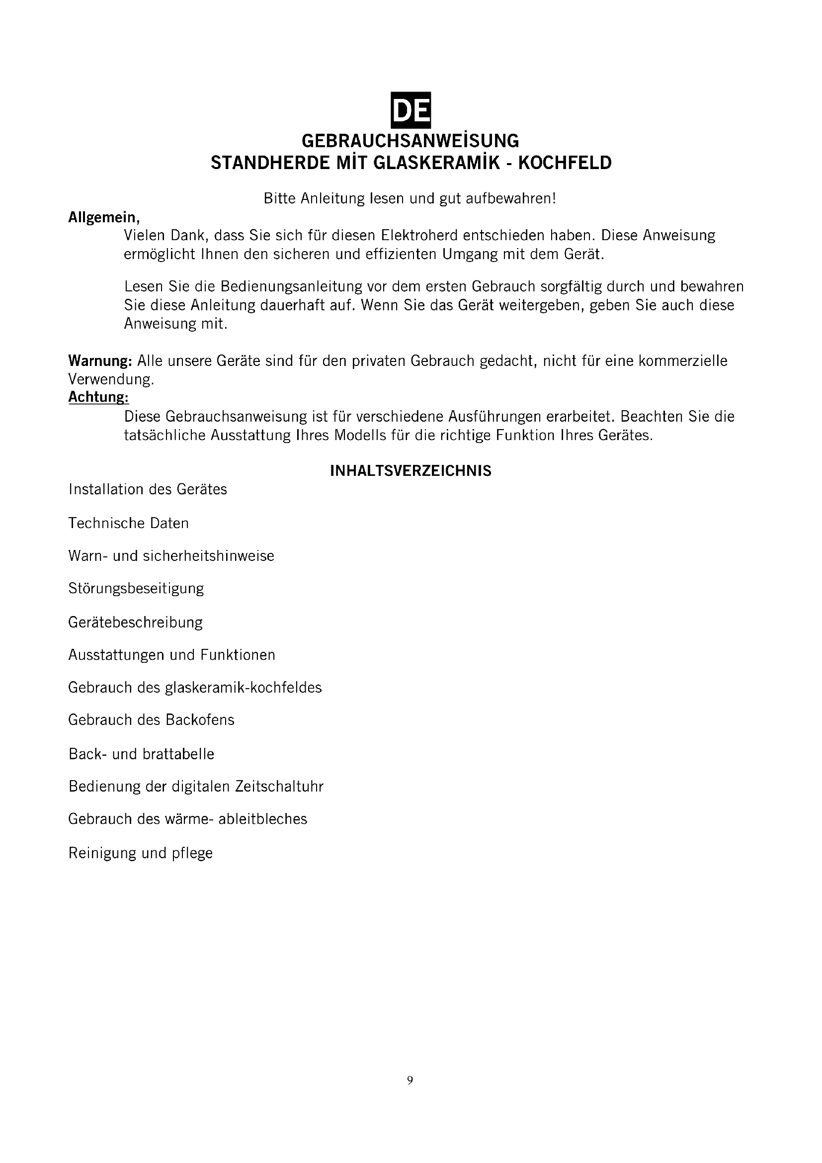Vielen Dank, dass Sie sich für diesen Elektroherd entschieden haben. Diese Anweisung ermöglicht Ohnen den sicheren und effizienten Umgang mit dem Gerät.