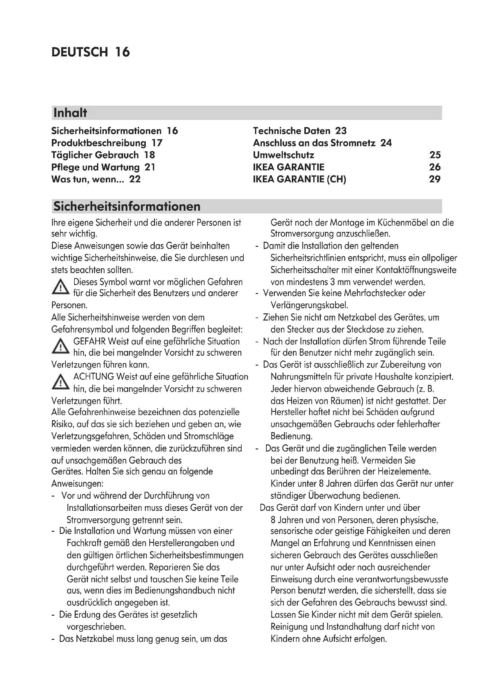 - ask for clarication on functions of IKEA appliances. To ensure that we provide you with the best assistance, please read carefully the Assembly Instructions and/or the User Manual before contacting us. How to reach us if you need our service Please refer to the last page of this manual for the full list of IKEA appointed After Sales Service Provider and relative national phone numbers. In order to provide you a quicker service, we recommend to use the specic phone numbers listed on this manual. Always refer to the numbers listed in the booklet of the specic appliance you need an assistance for. Please also always refer to the IKEA article number (8 digit code) and 12 digit service number placed on the rating plate of your appliance. SAVE THE SALES RECEIPT! It is your proof of purchase and required for the guarantee to apply. The sales receipt also reports the IKEA name and article number (8 digit code) for each of the appliances you have purchased. Do you need extra help? For any additional questions not related to After Sales of your appliances please contact your nearest IKEA store call centre. We recommend you read the appliance documentation carefully before contacting us.DEUTSCH 16 Ihre eigene Sicherheit und die anderer Personen ist sehr wichtig. Diese Anweisungen sowie das Gerät beinhalten wichtige Sicherheitshinweise, die Sie durchlesen und stets beachten sollten. Dieses Symbol warnt vor möglichen Gefahren für die Sicherheit des Benutzers und anderer Personen. Alle Sicherheitshinweise werden von dem Gefahrensymbol und folgenden Begriffen begleitet: GEFAHR Weist auf eine gefährliche Situation hin, die bei mangelnder Vorsicht zu schweren Verletzungen führen kann. ACHTUNG Weist auf eine gefährliche Situation hin, die bei mangelnder Vorsicht zu schweren Verletzungen führt. Alle Gefahrenhinweise bezeichnen das potenzielle Risiko, auf das sie sich beziehen und geben an, wie Verletzungsgefahren, Schäden und Stromschläge vermieden werden können, die zurückzuführen sind auf unsachgemäßen Gebrauch des Gerätes. Halten Sie sich genau an folgende Anweisungen: - Vor und während der Durchführung von Installationsarbeiten muss dieses Gerät von der Stromversorgung getrennt sein. - Die Installation und Wartung müssen von einer Fachkraft gemäß den Herstellerangaben und den gültigen örtlichen Sicherheitsbestimmungen durchgeführt werden. Reparieren Sie das Gerät nicht selbst und tauschen Sie keine Teile aus, wenn dies im Bedienungshandbuch nicht ausdrücklich angegeben ist. - Die Erdung des Gerätes ist gesetzlich vorgeschrieben. - Das Netzkabel muss lang genug sein, um das Gerät nach der Montage im Küchenmöbel an die Stromversorgung anzuschließen. - Damit die Installation den geltenden Sicherheitsrichtlinien entspricht, muss ein allpoliger Sicherheitsschalter mit einer Kontaktöffnungsweite von mindestens 3 mm verwendet werden. - Verwenden Sie keine Mehrfachstecker oder Verlängerungskabel. - Ziehen Sie nicht am Netzkabel des Gerätes, um den Stecker aus der Steckdose zu ziehen. - Nach der Installation dürfen Strom führende Teile für den Benutzer nicht mehr zugänglich sein. - Das Gerät ist ausschließlich zur Zubereitung von Nahrungsmitteln für private Haushalte konzipiert. Jeder hiervon abweichende Gebrauch (z. B. das Heizen von Räumen) ist nicht gestattet. Der Hersteller haftet nicht bei Schäden aufgrund unsachgemäßen Gebrauchs oder fehlerhafter Bedienung. - Das Gerät und die zugänglichen Teile werden bei der Benutzung heiß. Vermeiden Sie unbedingt das Berühren der Heizelemente. Kinder unter 8 Jahren dürfen das Gerät nur unter ständiger Überwachung bedienen. Das Gerät darf von Kindern unter und über 8 Jahren und von Personen, deren physische, sensorische oder geistige Fähigkeiten und deren Mangel an Erfahrung und Kenntnissen einen sicheren Gebrauch des Gerätes ausschließen nur unter Aufsicht oder nach ausreichender Einweisung durch eine verantwortungsbewusste Person benutzt werden, die sicherstellt, dass sie sich der Gefahren des Gebrauchs bewusst sind. Lassen Sie Kinder nicht mit dem Gerät spielen. Reinigung und Instandhaltung darf nicht von Kindern ohne Aufsicht erfolgen. Sicherheitsinformationen Inhalt Sicherheitsinformationen 16 Produktbeschreibung 17 Täglicher Gebrauch 18 Pege und Wartung 21 Was tun, wenn... 22 Technische Daten 23 Anschluss an das Stromnetz 24 Umweltschutz 25 IKEA GARANTIE 26
