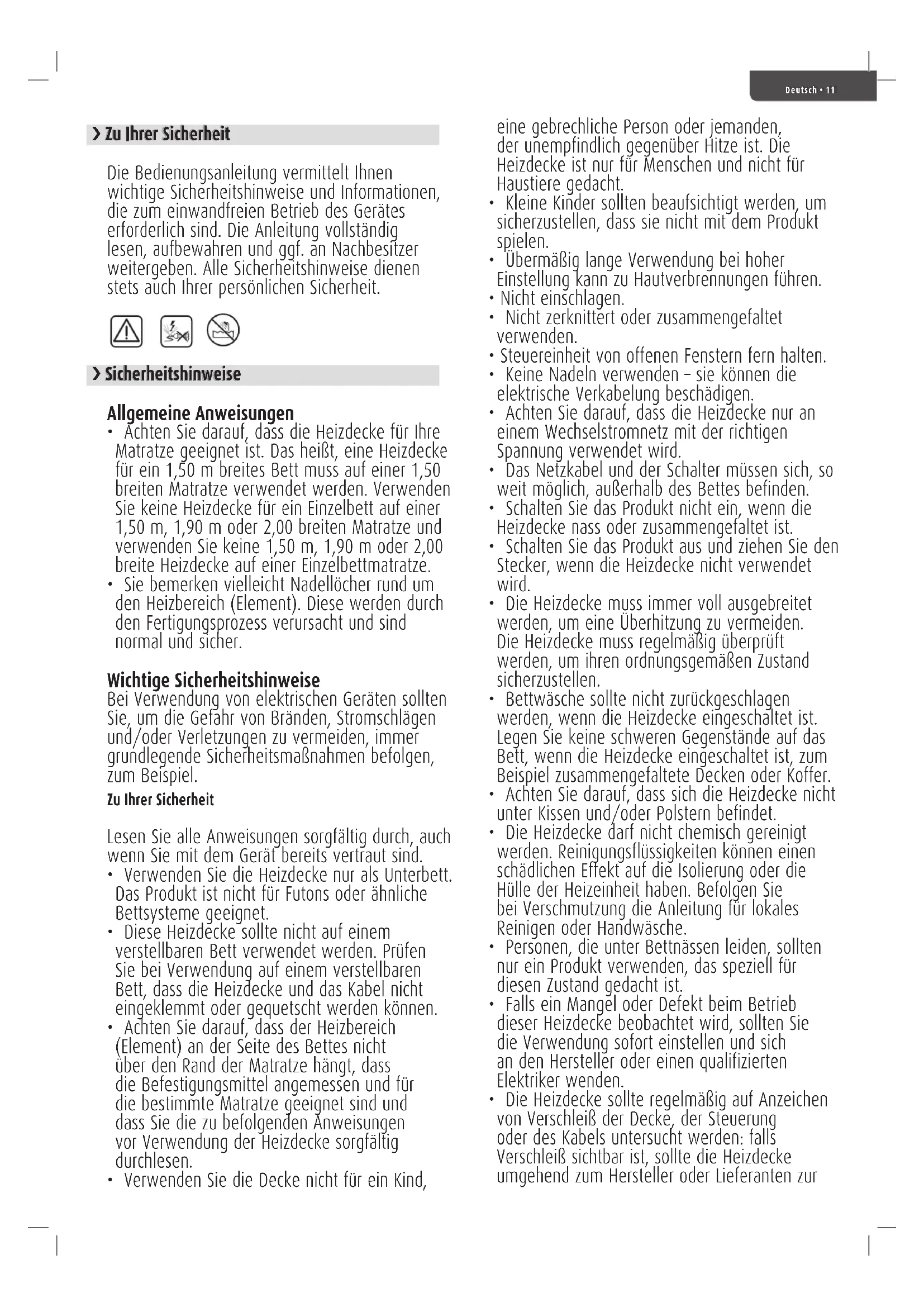 - Die Heizdecke muss immer voll ausgebreitet werden, um eine Überhitzung zu vermeiden. Die Heizdecke muss regelmäßig überprüft werden, um ihren ordnungsgemäßen Zustand sicherzustellen.