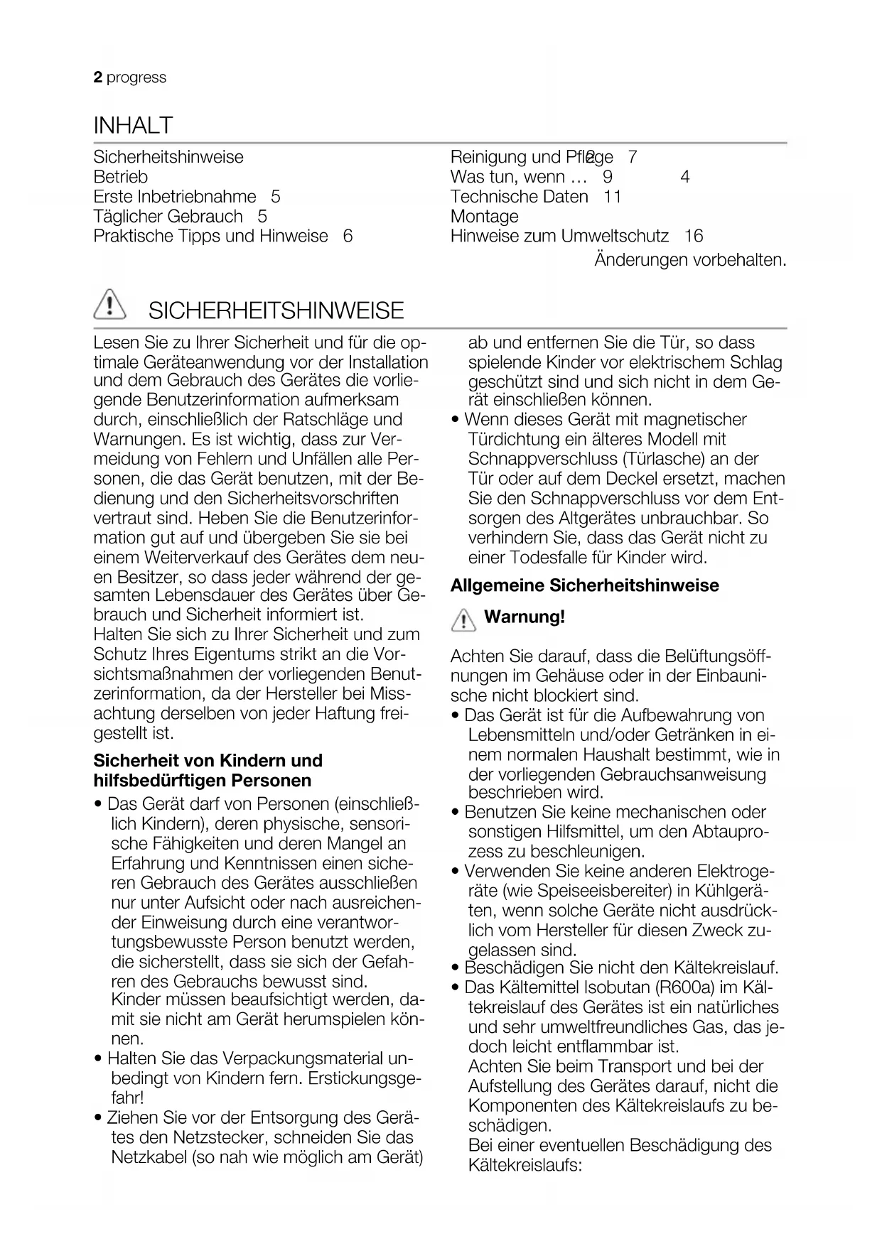- Das Kältemittel Isobutan (R600a) im Käl- tekreislauf des Gerätes ist ein natürliches und sehr umweltfreundliches Gas, das je- doch leicht entflammbar ist. Achten Sie beim Transport und bei der Aufstellung des Gerätes darauf, nicht die Komponenten des Kältekreislaufs zu be- schädigen. Bei einer eventuellen Beschädigung des Kältekreislaufs: 2 progress– Offene Flammen und Zündfunken ver- meiden – Den Raum, in dem das Gerät installiert ist, gut lüften