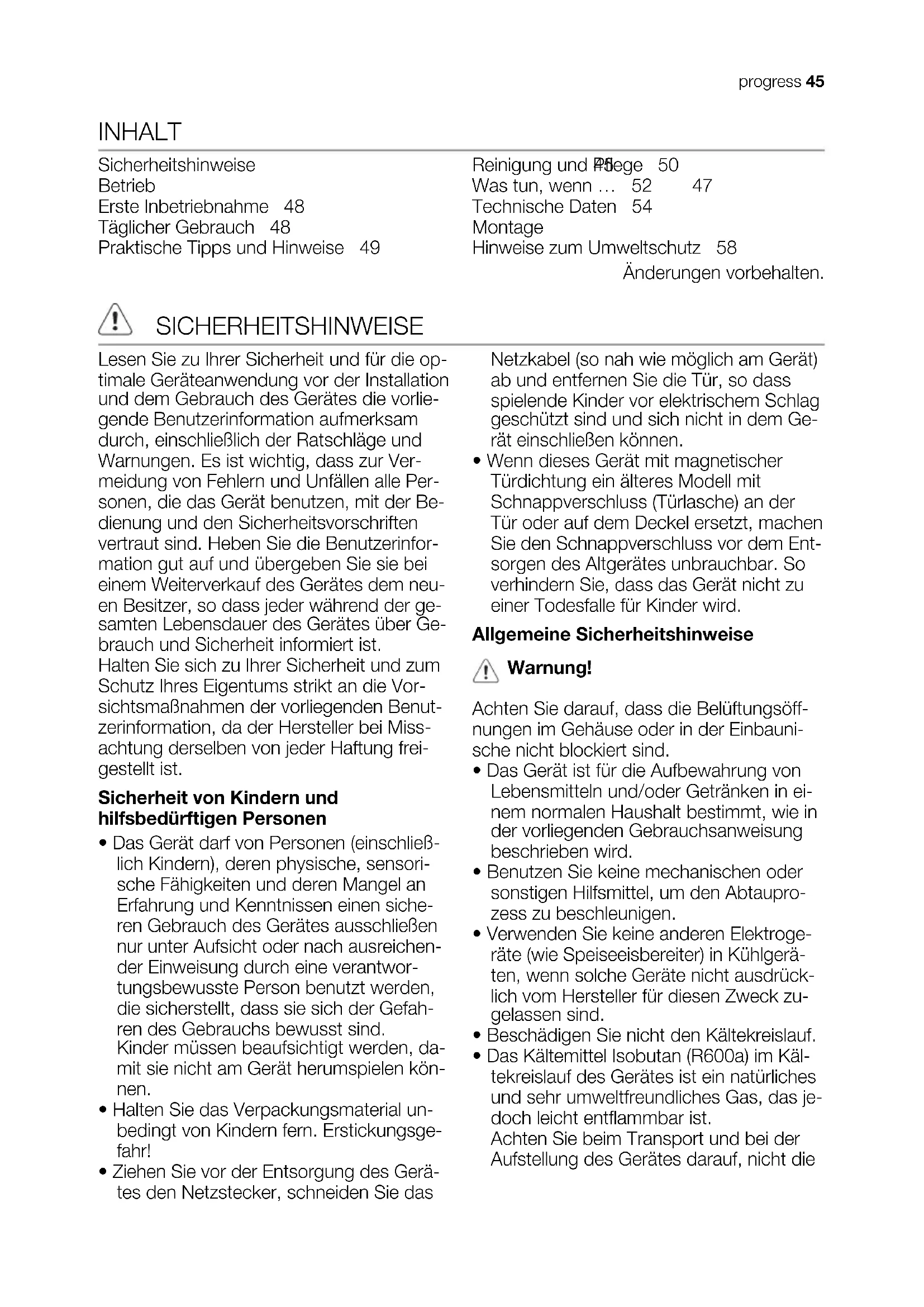 - La porte s'ouvre et se ferme correcte- ment. progress 43Réversibilité de la porte du congélateur 180˚ EN MATIÈRE DE SAUVEGARDE DE L'ENVIRONNEMENT Le symbole sur le produit ou son emballage indique que ce produit ne peut être traité comme déchet ménager. Il doit être remis au point de collecte dédié à cet effet (collecte et recyclage du matériel électrique et électronique). En procédant à la mise au rebut de l'appareil dans les règles de l’art, nous préservons l'environnement et notre sécurité, s’assurant ainsi que les déchets seront traités dans des conditions optimum. Pour obtenir plus de détails sur le recyclage de ce produit, veuillez prendre contact avec les services de votre commune ou le magasin où vous avez effectué l'achat. 44 progressINHALT Sicherheitshinweise 45 Betrieb 47 Erste Inbetriebnahme 48 Täglicher Gebrauch 48 Praktische Tipps und Hinweise 49 Reinigung und Pflege 50 Was tun, wenn … 52 Technische Daten 54 Montage 54 Hinweise zum Umweltschutz 58 Änderungen vorbehalten. SICHERHEITSHINWEISE Lesen Sie zu Ihrer Sicherheit und für die op- timale Geräteanwendung vor der Installation und dem Gebrauch des Gerätes die vorlie- gende Benutzerinformation aufmerksam durch, einschließlich der Ratschläge und Warnungen. Es ist wichtig, dass zur Ver- meidung von Fehlern und Unfällen alle Per- sonen, die das Gerät benutzen, mit der Be- dienung und den Sicherheitsvorschriften vertraut sind. Heben Sie die Benutzerinfor- mation gut auf und übergeben Sie sie bei einem Weiterverkauf des Gerätes dem neu- en Besitzer, so dass jeder während der ge- samten Lebensdauer des Gerätes über Ge- brauch und Sicherheit informiert ist. Halten Sie sich zu Ihrer Sicherheit und zum Schutz Ihres Eigentums strikt an die Vor- sichtsmaßnahmen der vorliegenden Benut- zerinformation, da der Hersteller bei Miss- achtung derselben von jeder Haftung frei- gestellt ist. Sicherheit von Kindern und hilfsbedürftigen Personen