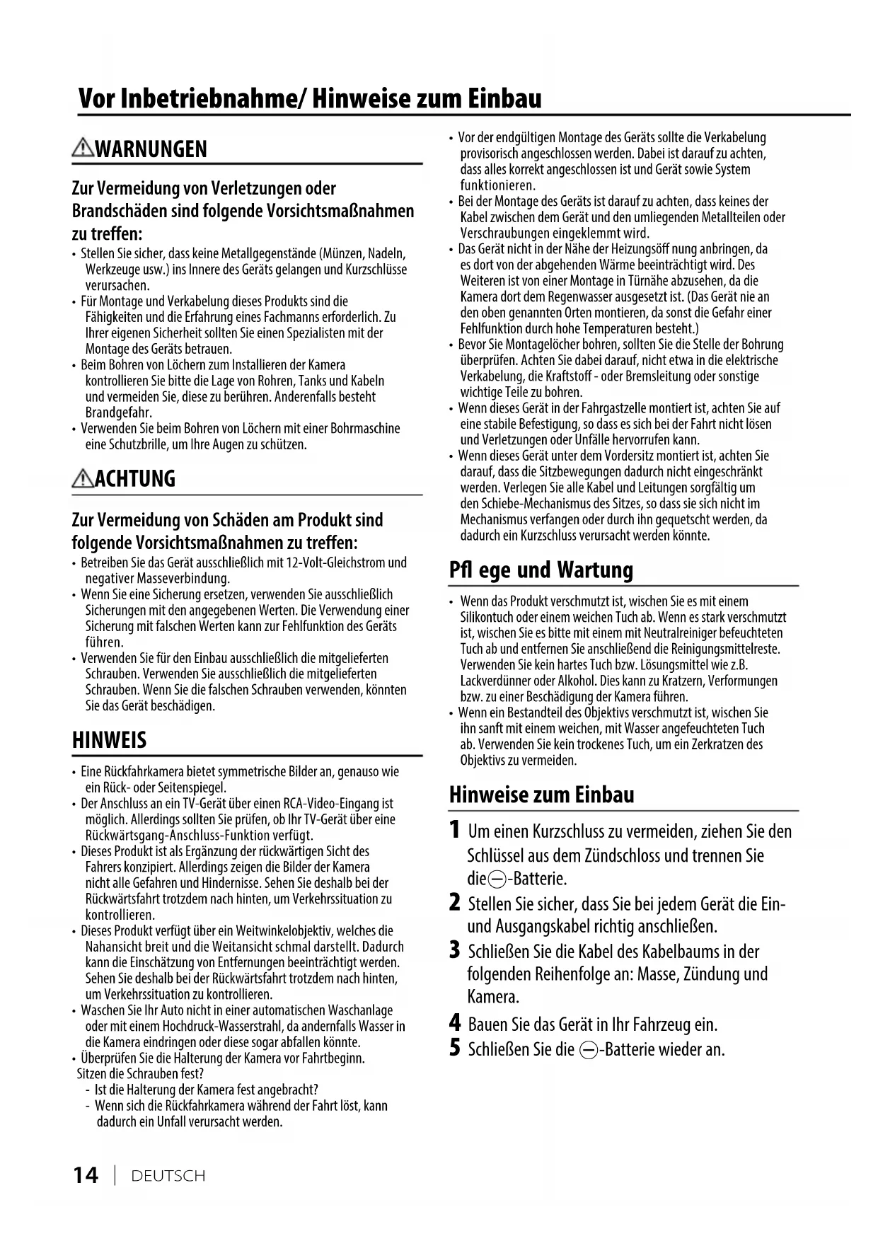 Wenn das Produkt verschmutzt ist, wischen Sie es mit einem Silikontuch oder einem weichen Tuch ab. Wenn es stark verschmutzt ist, wischen Sie es bitte mit einem mit Neutralreiniger befeuchteten Tuch ab und entfernen Sie anschließend die Reinigungsmittelreste. Verwenden Sie kein hartes Tuch bzw. Lösungsmittel wie z.B. Lackverdünner oder Alkohol. Dies kann zu Kratzern, Verformungen bzw. zu einer Beschädigung der Kamera führen.• Wenn ein Bestandteil des Objektivs verschmutzt ist, wischen Sie ihn sanft mit einem weichen, mit Wasser angefeuchteten Tuch ab. Verwenden Sie kein trockenes Tuch, um ein Zerkratzen des Objektivs zu vermeiden. Hinweise zum Einbau 1 Um einen Kurzschluss zu vermeiden, ziehen Sie den Schlüssel aus dem Zündschloss und trennen Sie die--Batterie. 2 Stellen Sie sicher, dass Sie bei jedem Gerät die Ein- und Ausgangskabel richtig anschließen. 3 Schließen Sie die Kabel des Kabelbaums in der folgenden Reihenfolge an: Masse, Zündung und Kamera. 4 Bauen Sie das Gerät in Ihr Fahrzeug ein. 5 Schließen Sie die --Batterie wieder an. WARNUNGEN Zur Vermeidung von Verletzungen oder Brandschäden sind folgende Vorsichtsmaßnahmen zu treffen: