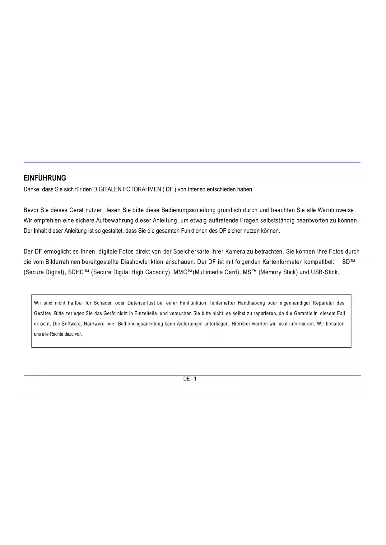 Warum ist die reale Kapazität einer Speicherkarte geringer als auf der Verpackung angegeben? Die Angabe der Speicherkapazität eines Flash Speichermediums erfolgt analog zu der Kapazitätsangabe bei Festplatten und unterliegt den Richtlinien des SI (International System of Units). Dieses System misst nicht nach dem Binärsystem, bei dem 1024 MB zu einem 1 GB umgerechnet werden. Der SI Standard misst in 1000er Potenzen, wonach zum Beispiel 1000 Megabyte 1 Gigabyte ergeben. Durch diese unterschiedliche Berechnung kommt es zu einer Differenz in der Kapazitätsangabe. Warum werden einige Bilder meiner Speicherkarte vom DF nicht angezeigt? Einige nicht weitverbreitete Speichermedien sind mit dem DF nicht kompatibel. Nutzen Sie bitte eine kompatible Karte. Bedenken Sie bitte, dass dieser Bilderrahmen nur Fotos mit dem Dateiformat “JPEG” wiedergeben kann. Es ist eine Speicherkarte eingesteckt. Der DF kann jedoch nicht von dieser lesen. Was kann ich machen? Als erstes überprüfen Sie bitte, ob diese Karte kompatibel zum DIGITALEN FOTORAHMEN von Intenso ist. Überprüfen Sie danach, ob die Karte in der richtigen Art und Weise in den Kartenslot eingesteckt wurde. Denken Sie bitte auch daran, dass nur das Dateiformat „JPEG“ unterstützt wird. Bitte beachten Sie: Einige Digitalkameras speichern die Bilder nicht in dem Standardformat JPEG ab. Schauen Sie bitte in diesem Fall in der Gebrauchsanleitung Ihrer Kamera nach.DE - 33 Warum werden einige Bilder schneller geladen als andere? Bilder mit einer höheren Auflösung benötigen länger bis sie angezeigt werden können. Um die Anzeigegeschwindigkeit zu erhöhen, nutzen Sie bitte Bilder mit einer niedrigeren Auflösung. Hinweis: Der Photo Frame unterstützt eine Auflösung bis 8000*8000 Pixel. Warum startet die Software nicht, obwohl die Stromversorgung gegeben ist und Power auf “On” steht? Wahrscheinlich liegt ein Systemfehler vor. Bitte starten Sie die Software neu, indem Sie für ein paar Sekunden die Stromversorgung unterbrechen. Warum wird auf dem Display nicht das Hauptmenü angezeigt? Bitte überprüfen Sie, ob der DF ordnungsgemäß mit einer Steckdose verbunden ist und der Power Schalter auf “On” steht. Kann ich Bilder auf dem Display rotieren lassen? Ja, nutzen Sie das OSD Menü. Betätigen Sie hierzu die [OSD] Taste auf der Fernbedienung oder die [M] –Taste auf dem DF während des Betrachtens eines Bildes oder einer Diashow. Das OSD Menü erscheint auf dem Display. Bitte beachten Sie: Das rotierte Bild wird bei einer erneuten Anzeige wieder in der normalen Ansicht angezeigt.DE - 34 Kann ich die Farben der Bilder anpassen? Nein. Alle Farbeinstellungen werden während der Aufnahme der Fotos vorgenommen. Sie können aber die Helligkeit und den Kontrast des Displays anpassen. In welcher Auflösung sollten Bilder sein, um optimal auf dem Display dargestellt werden zu können? Die beste Auflösung für diesen DF ist 800 * 600 Pixel. Warum funktionieren die Funktionen: Automatisches Einschalten / Ausschalten nicht, obwohl ich sie aktiviert habe? Stellen Sie sicher, dass Sie die korrekte Uhrzeit eingestellt haben. Wenn die eingestellte Uhrzeit in der Vergangenheit liegt, wird die Funktion zum ersten Mal am nächsten Kalendertag aktiviert. Bitte schieben Sie den Schalter an der Rückseite des DF nicht in die POWER OFF Position. Versetzen Sie den DF lediglich in den Standby Modus.DE - 35 PRODUKT SPEZIFIKATIONEN Anzeige Digitales TFT LCD Display Größe: 8 Zoll (20,32 cm sichtbare Bilddiagonale) Anzeigemodus: 4:3 Auflösung: 800*600 Pixel Netzteil Input: 100~240V AC, 50/60Hz Output: 5V 2A DC USB port USB Host 2.0 Unterstützt USB Speichermedien Unterstützte Speicherkarten SD/SDHC™ (Secure Digital Card), MMC™ (MultiMedia Card), MS™ (Memory Stick) Unterstütztes Bildformat JPEG, Maximale Auflösung:8000*8000 pixels Betriebstemperatur 0°C ~ +45°C Abmessungen 225,5*185*22 mm Gewicht 553 gr. Zubehör Fernbedienung (inkl. Batterie), Standfuß, Netzgerät, mehrsprachige KurzanleitungDE - 36