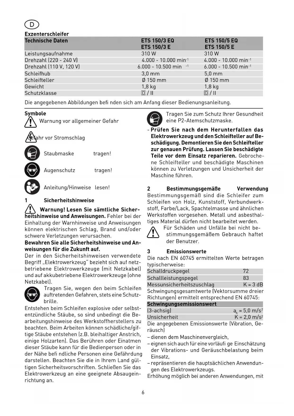 Die angegebenen Emissionswerte (Vibration, Ge- räusch) – dienen dem Maschinenvergleich, – eignen sich auch für eine vorläufi ge Einschätzung der Vibrations- und Geräuschbelastung beim Einsatz, – repräsentieren die hauptsächlichen Anwendun- gen des Elektrowerkzeugs. Erhöhung möglich bei anderen Anwendungen, mit Exzenterschleifer Technische Daten ETS 150/3 EQ ETS 150/5 EQ