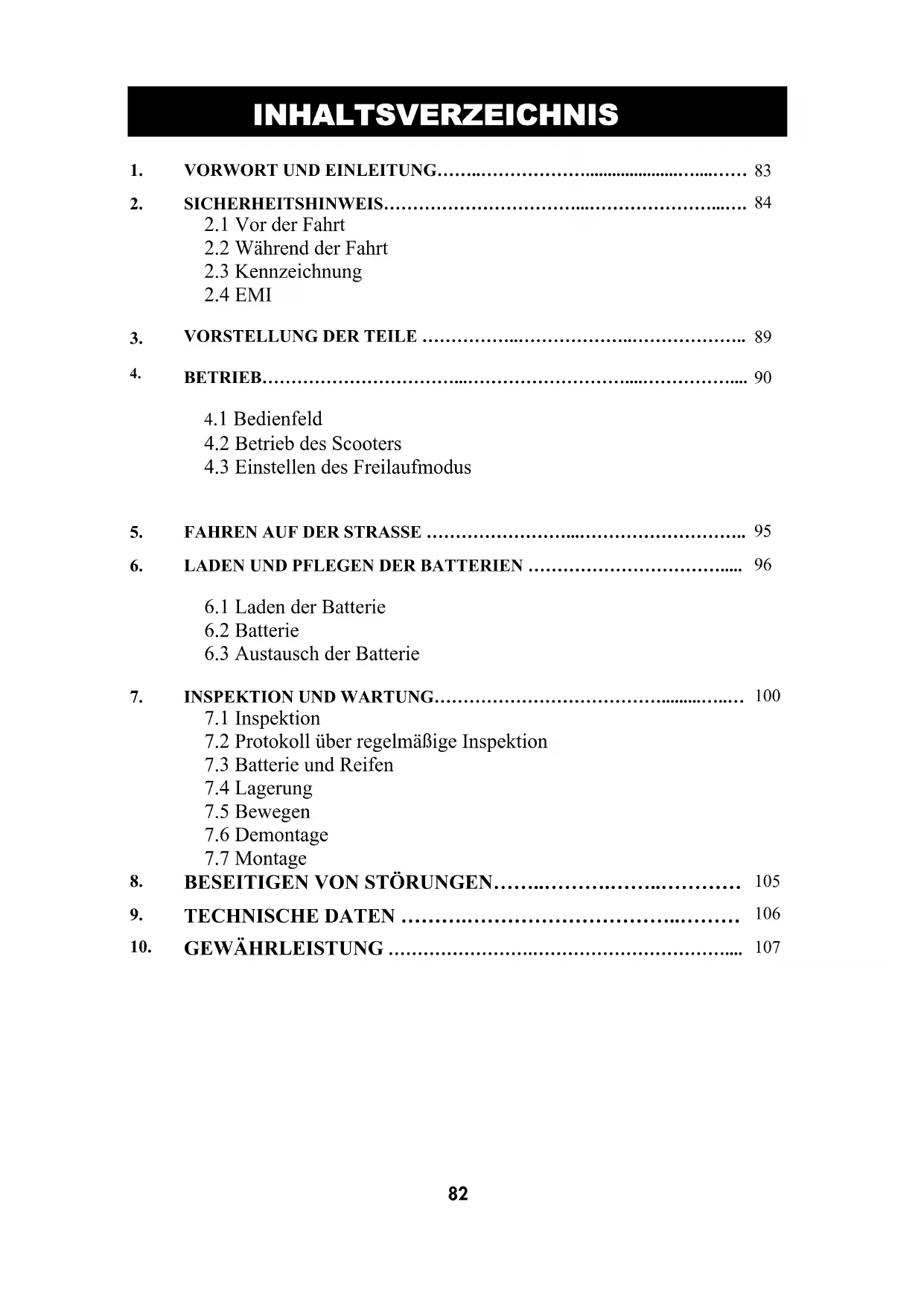 ■ Für die Nutzung dieses Fahrzeugs gelten die gleichen Verkehrsregeln wie für Fußgänger ♦ Zu Ihrer Sicherheit befolgen und beachten Sie bitte die gleichen Verkehrsregeln wie Fußgänger. ♦ Fahren Sie den Scooter nicht, wenn Sie Alkohol getrunken haben oder müde sind. ♦ Seien Sie vorsichtig, wenn Sie den Scooter in schlechten Lichtverhältnissen fahren. Er ist nicht für die Nutzung während der Nacht vorgesehen. ♦ Seien Sie besonders vorsichtig, wenn Sie den Scooter in belebten Zonen oder Einkaufszentren fahren. ♦ Fahren Sie nur auf dem Bürgersteig, einspurigen Straßen oder in Fußgängerzonen. Fahren Sie nie auf Schnellstraßen oder zweispurigen Straßen. ♦ Achten Sie beim Befahren oder Überqueren von Straßen auf den Verkehr. ■ Üben Sie die Bedienung Ihres Fahrzeugs Machen Sie sich mit der Bedienung des Scooters vertraut, bevor Sie ihn in belebten oder möglicherweise gefährlichen Umgebungen verwenden. Üben Sie auf einem großen, freien Gelände, beispielsweise in einem Park. Um Unfälle während der Fahrt mit dem Scooter zu vermeiden, berücksichtigen Sie Fahrbewegungen wie Beschleunigen, Anhalten, Wenden, Rückwärtsfahren, Hoch- und Herunterfahren von Rampen. ♦ Drehen Sie den Geschwindigkeitsregler zum Üben anfangs auf den minimalen Wert. ♦ Lassen Sie sich aus Sicherheitsgründen von jemandem begleiten, wenn Sie zum ersten Mal auf der Straße fahren. ♦ Nutzen Sie die höhere Geschwindigkeitseinstellung erst, wenn Sie sicher sind, dass Sie Ihren Scooter leicht nutzen und steuern können. ■ Der Scooter darf nur von einer Person auf einmal verwendet werden. Befördern Sie keine Passagiere (einschließlich Kindern) auf Ihrem Scooter. ■ Verwenden Sie dieses Fahrzeug nicht zum Tragen oder Schleppen von Gütern ♦ Das maximal zu befördernde Gewicht beträgt 125kg/275 lbs (einschließlich Fahrer und ggf. Gütern). Siehe „MAX. BELASTUNG“ in „9. TECHNISCHE DATEN“. ♦ Die maximale Last für den Korb beträgt 3 kg (7 lb). ■ Führen Sie tägliche Inspektionen durch. Siehe Abschnitt „TÄGLICHE INSPEKTION“.85