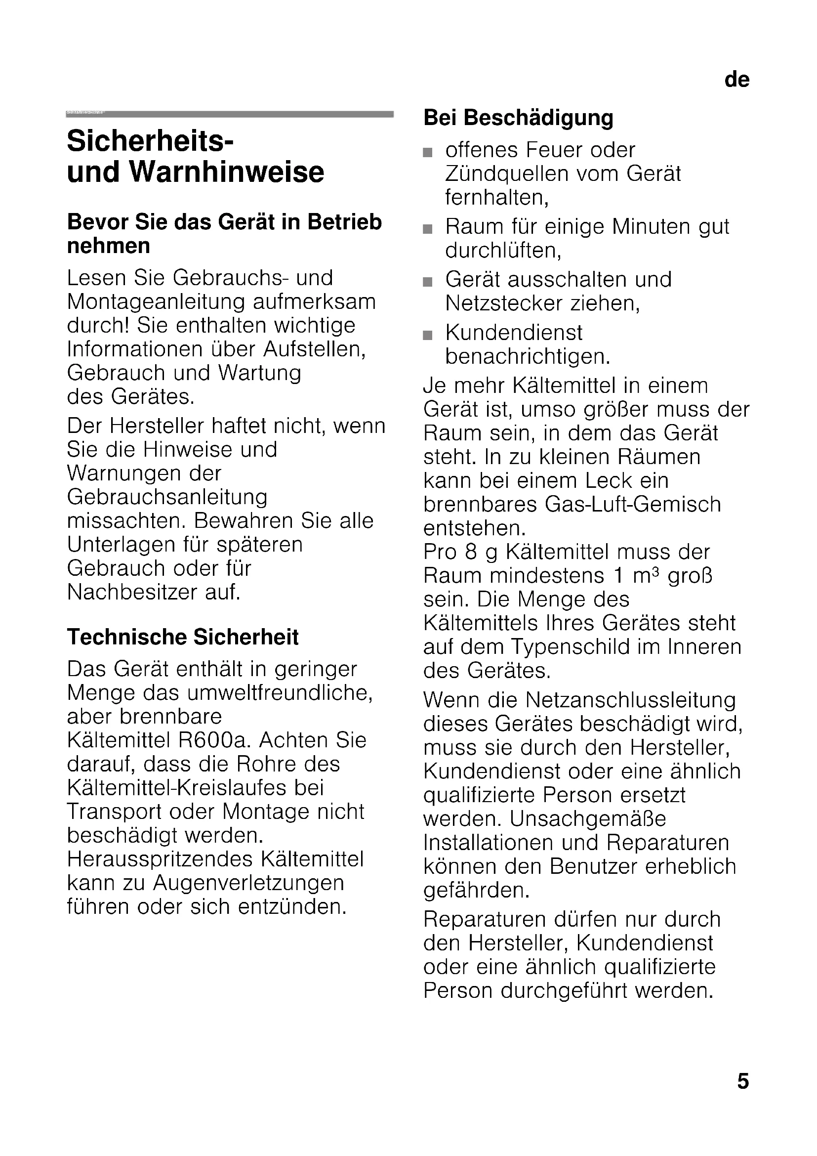 deInhaltsverzeichnis deGebrauchsanleitung Sicherheits- und Warnhinweise Bevor Sie das Gerät in Betrieb nehmen Lesen Sie Gebrauchs- und Montageanleitung aufmerksam durch! Sie enthalten wichtige Informationen über Aufstellen, Gebrauch und Wartung des Gerätes. Der Hersteller haftet nicht, wenn Sie die Hinweise und Warnungen der Gebrauchsanleitung missachten. Bewahren Sie alle Unterlagen für späteren Gebrauch oder für Nachbesitzer auf. Technische Sicherheit Das Gerät enthält in geringer Menge das umweltfreundliche, aber brennbare Kältemittel R600a. Achten Sie darauf, dass die Rohre des Kältemittel-Kreislaufes bei Transport oder Montage nicht beschädigt werden. Herausspritzendes Kältemittel kann zu Augenverletzungen führen oder sich entzünden. Bei Beschädigung ■ offenes Feuer oder Zündquellen vom Gerät fernhalten, ■ Raum für einige Minuten gut durchlüften, ■ Gerät ausschalten und Netzstecker ziehen, ■ Kundendienst benachrichtigen. Je mehr Kältemittel in einem Gerät ist, umso größer muss der Raum sein, in dem das Gerät steht. In zu kleinen Räumen kann bei einem Leck ein brennbares Gas-Luft-Gemisch entstehen. Pro 8 g Kältemittel muss der Raum mindestens 1 m³ groß sein. Die Menge des Kältemittels Ihres Gerätes steht auf dem Typenschild im Inneren des Gerätes. Wenn die Netzanschlussleitung dieses Gerätes beschädigt wird, muss sie durch den Hersteller, Kundendienst oder eine ähnlich qualifizierte Person ersetzt werden. Unsachgemäße Installationen und Reparaturen können den Benutzer erheblich gefährden. Reparaturen dürfen nur durch den Hersteller, Kundendienst oder eine ähnlich qualifizierte Person durchgeführt werden.de
