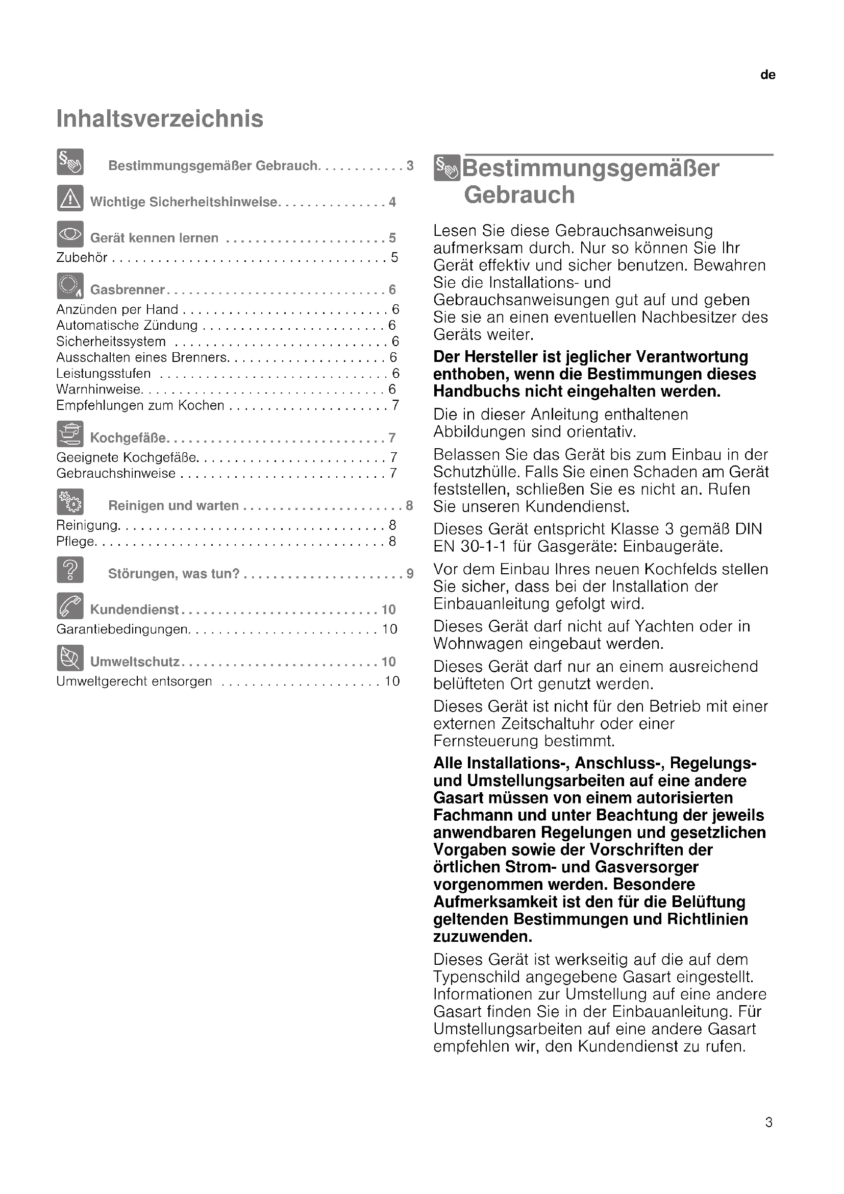 - Gerät kennen lernen . . . . . . . . . . . . . . . . . . . . . . 5 Zubehör . . . . . . . . . . . . . . . . . . . . . . . . . . . . . . . . . . . . 5 Ä Gasbrenner. . . . . . . . . . . . . . . . . . . . . . . . . . . . . . 6 Anzünden per Hand . . . . . . . . . . . . . . . . . . . . . . . . . . . 6 Automatische Zündung . . . . . . . . . . . . . . . . . . . . . . . . 6 Sicherheitssystem . . . . . . . . . . . . . . . . . . . . . . . . . . . . 6 Ausschalten eines Brenners. . . . . . . . . . . . . . . . . . . . . 6 Leistungsstufen . . . . . . . . . . . . . . . . . . . . . . . . . . . . . . 6 Warnhinweise. . . . . . . . . . . . . . . . . . . . . . . . . . . . . . . . 6 Empfehlungen zum Kochen . . . . . . . . . . . . . . . . . . . . . 7 Å Kochgefäße. . . . . . . . . . . . . . . . . . . . . . . . . . . . . . 7 Geeignete Kochgefäße. . . . . . . . . . . . . . . . . . . . . . . . . 7 Gebrauchshinweise . . . . . . . . . . . . . . . . . . . . . . . . . . . 7 2 Reinigen und warten . . . . . . . . . . . . . . . . . . . . . . 8 Reinigung. . . . . . . . . . . . . . . . . . . . . . . . . . . . . . . . . . . 8 Pflege. . . . . . . . . . . . . . . . . . . . . . . . . . . . . . . . . . . . . . 8 3 Störungen, was tun? . . . . . . . . . . . . . . . . . . . . . . 9 4 Kundendienst . . . . . . . . . . . . . . . . . . . . . . . . . . . 10 Garantiebedingungen. . . . . . . . . . . . . . . . . . . . . . . . . 10 7 Umweltschutz. . . . . . . . . . . . . . . . . . . . . . . . . . . 10 Umweltgerecht entsorgen . . . . . . . . . . . . . . . . . . . . . 10 8Bestimmungsgemäßer Gebrauch Bestimmungsgemäßer Gebrauch Lesen Sie diese Gebrauchsanweisung aufmerksam durch. Nur so können Sie Ihr Gerät effektiv und sicher benutzen. Bewahren Sie die Installations- und Gebrauchsanweisungen gut auf und geben Sie sie an einen eventuellen Nachbesitzer des Geräts weiter. Der Hersteller ist jeglicher Verantwortung enthoben, wenn die Bestimmungen dieses Handbuchs nicht eingehalten werden. Die in dieser Anleitung enthaltenen Abbildungen sind orientativ. Belassen Sie das Gerät bis zum Einbau in der Schutzhülle. Falls Sie einen Schaden am Gerät feststellen, schließen Sie es nicht an. Rufen Sie unseren Kundendienst. Dieses Gerät entspricht Klasse 3 gemäß DIN EN 30-1-1 für Gasgeräte: Einbaugeräte. Vor dem Einbau Ihres neuen Kochfelds stellen Sie sicher, dass bei der Installation der Einbauanleitung gefolgt wird. Dieses Gerät darf nicht auf Yachten oder in Wohnwagen eingebaut werden. Dieses Gerät darf nur an einem ausreichend belüfteten Ort genutzt werden. Dieses Gerät ist nicht für den Betrieb mit einer externen Zeitschaltuhr oder einer Fernsteuerung bestimmt. Alle Installations-, Anschluss-, Regelungs- und Umstellungsarbeiten auf eine andere Gasart müssen von einem autorisierten Fachmann und unter Beachtung der jeweils anwendbaren Regelungen und gesetzlichen Vorgaben sowie der Vorschriften der örtlichen Strom- und Gasversorger vorgenommen werden. Besondere Aufmerksamkeit ist den für die Belüftung geltenden Bestimmungen und Richtlinien zuzuwenden. Dieses Gerät ist werkseitig auf die auf dem Typenschild angegebene Gasart eingestellt. Informationen zur Umstellung auf eine andere Gasart finden Sie in der Einbauanleitung. Für Umstellungsarbeiten auf eine andere Gasart empfehlen wir, den Kundendienst zu rufen.de Wichtige Sicherheitshinweise