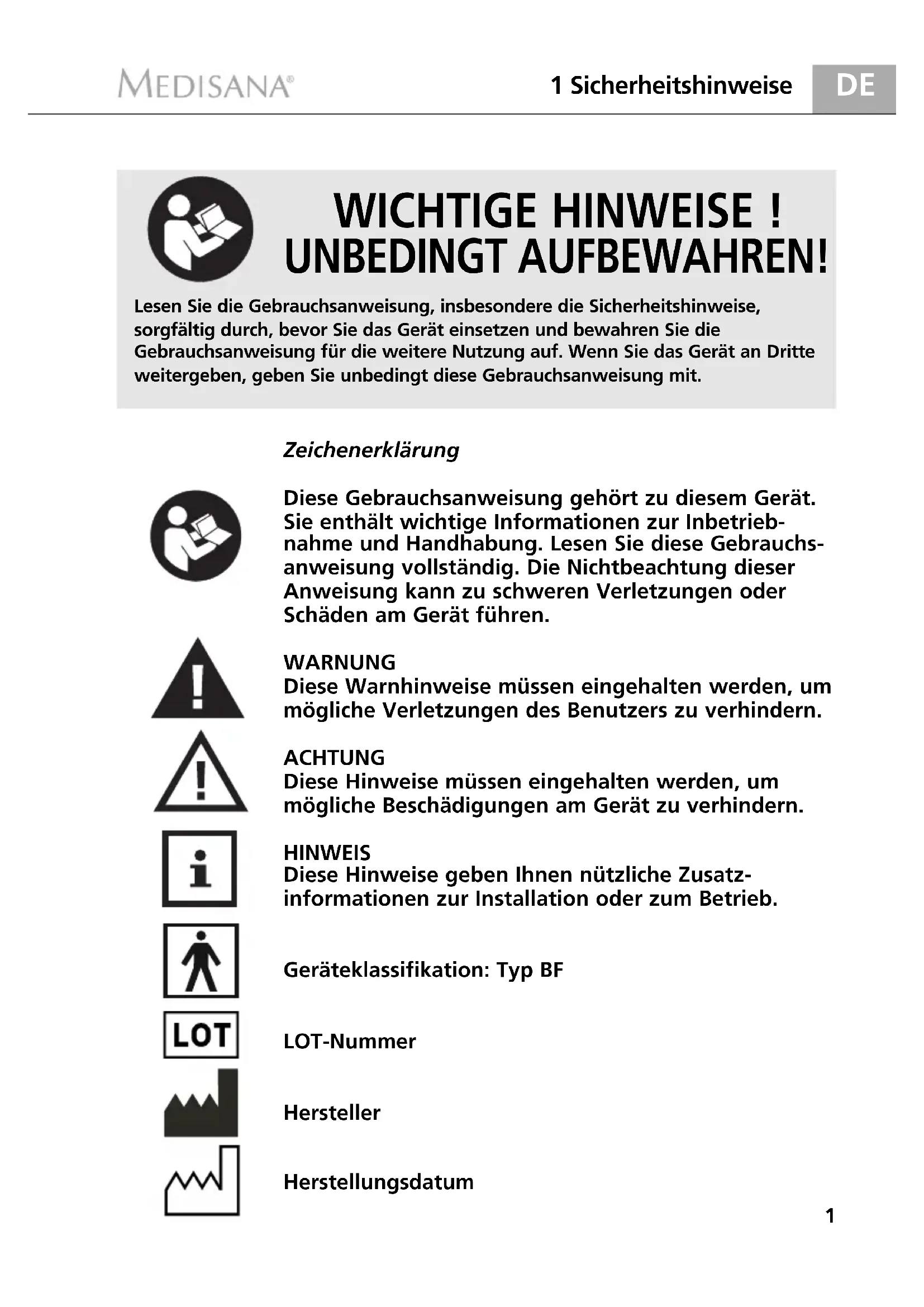 1 Sicherheitshinweise WICHTIGE HINWEISE ! UNBEDINGT AUFBEWAHREN! ZeichenerklärungDiese Gebrauchsanweisung gehört zu diesem Gerät.Sie enthält wichtige Informationen zur Inbetrieb-nahme und Handhabung. Lesen Sie diese Gebrauchs-anweisung vollständig. Die Nichtbeachtung dieserAnweisung kann zu schweren Verletzungen oderSchäden am Gerät führen.WARNUNGDiese Warnhinweise müssen eingehalten werden, ummögliche Verletzungen des Benutzers zu verhindern.ACHTUNGDiese Hinweise müssen eingehalten werden, ummögliche Beschädigungen am Gerät zu verhindern.HINWEISDiese Hinweise geben Ihnen nützliche Zusatz-informationen zur Installation oder zum Betrieb.Geräteklassifikation: Typ BFLOT-NummerHerstellerHerstellungsdatum