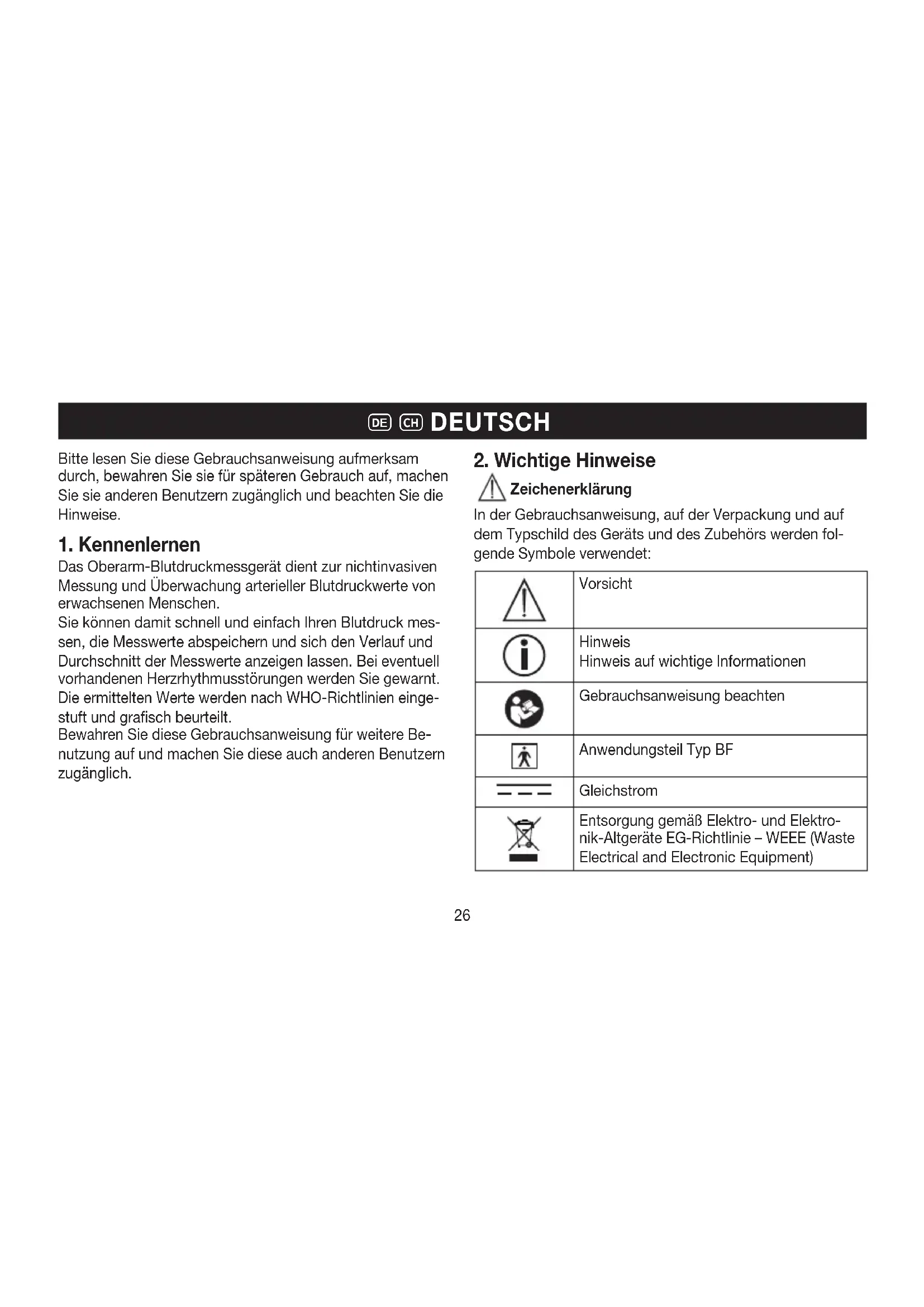 Zeichenerklärung In der Gebrauchsanweisung, auf der Verpackung und auf dem Typschild des Geräts und des Zubehörs werden fol- gende Symbole verwendet: Vorsicht Hinweis Hinweis auf wichtige Informationen Gebrauchsanweisung beachten Anwendungsteil Typ BF Gleichstrom Entsorgung gemäß Elektro- und Elektro- nik-Altgeräte EG-Richtlinie – WEEE (Waste Electrical and Electronic Equipment)