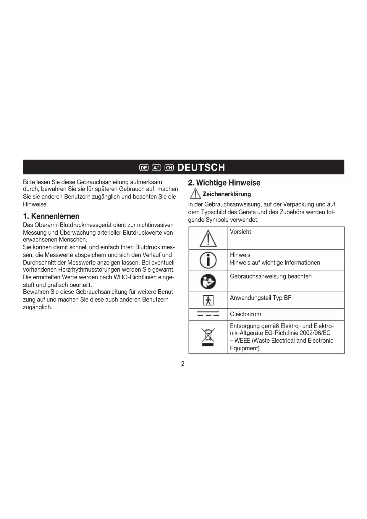 Zeichenerklärung In der Gebrauchsanweisung, auf der Verpackung und auf dem Typschild des Geräts und des Zubehörs werden fol- gende Symbole verwendet: Vorsicht Hinweis Hinweis auf wichtige Informationen Gebrauchsanweisung beachten Anwendungsteil Typ BF Gleichstrom Entsorgung gemäß Elektro- und Elektro- nik-Altgeräte EG-Richtlinie 2002/96/EC – WEEE (Waste Electrical and Electronic Equipment)