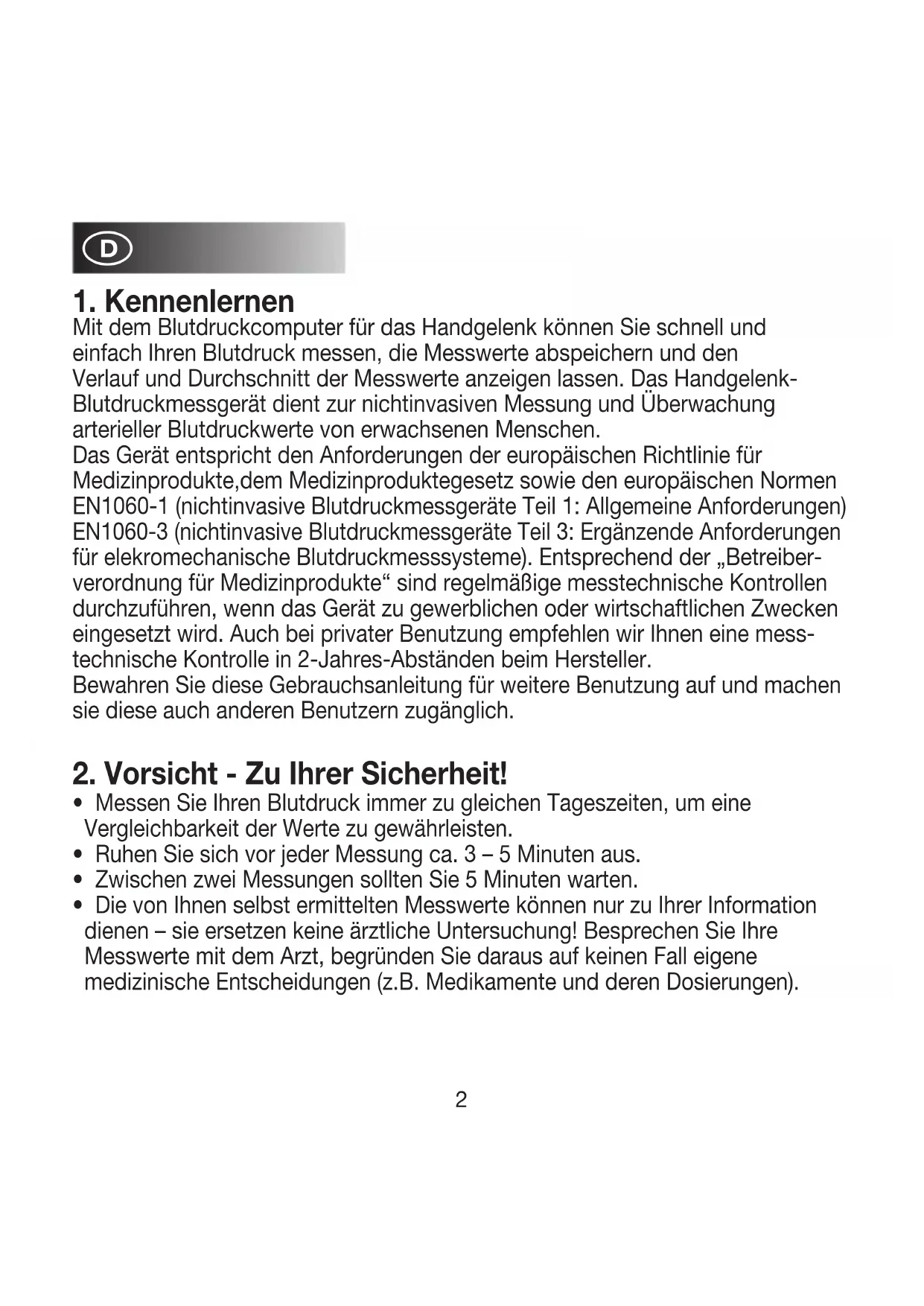 Mit dem Blutdruckcomputer für das Handgelenk können Sie schnell und einfach Ihren Blutdruck messen, die Messwerte abspeichern und den Verlauf und Durchschnitt der Messwerte anzeigen lassen. Das Handgelenk- Blutdruckmessgerät dient zur nichtinvasiven Messung und Überwachung arterieller Blutdruckwerte von erwachsenen Menschen. Das Gerät entspricht den Anforderungen der europäischen Richtlinie für Medizinprodukte,dem Medizinproduktegesetz sowie den europäischen Normen EN1060-1 (nichtinvasive Blutdruckmessgeräte Teil 1: Allgemeine Anforderungen) EN1060-3 (nichtinvasive Blutdruckmessgeräte Teil 3: Ergänzende Anforderungen für elekromechanische Blutdruckmesssysteme). Entsprechend der „Betreiber- verordnung für Medizinprodukte“ sind regelmäßige messtechnische Kontrollen durchzuführen, wenn das Gerät zu gewerblichen oder wirtschaftlichen Zwecken eingesetzt wird. Auch bei privater Benutzung empfehlen wir Ihnen eine mess- technische Kontrolle in 2-Jahres-Abständen beim Hersteller. Bewahren Sie diese Gebrauchsanleitung für weitere Benutzung auf und machen sie diese auch anderen Benutzern zugänglich.