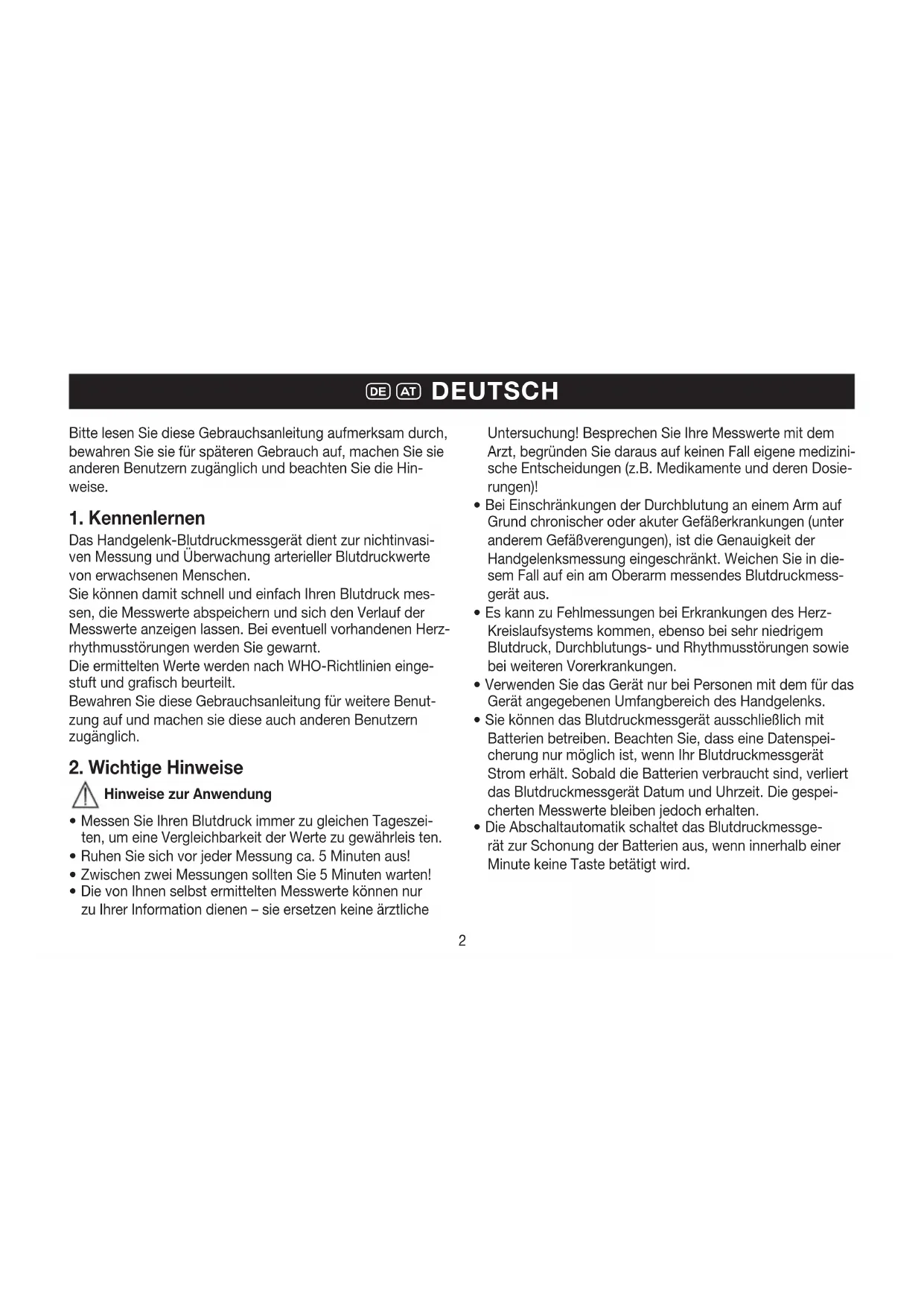 Das Handgelenk-Blutdruckmessgerät dient zur nichtinvasi- ven Messung und Überwachung arterieller Blutdruckwerte von erwachsenen Menschen. Sie können damit schnell und einfach Ihren Blutdruck mes- sen, die Messwerte abspeichern und sich den Verlauf der Messwerte anzeigen lassen. Bei eventuell vorhandenen Herz- rhythmusstörungen werden Sie gewarnt. Die ermittelten Werte werden nach WHO-Richtlinien einge- stuft und grafisch beurteilt. Bewahren Sie diese Gebrauchsanleitung für weitere Benut- zung auf und machen sie diese auch anderen Benutzern zugänglich.