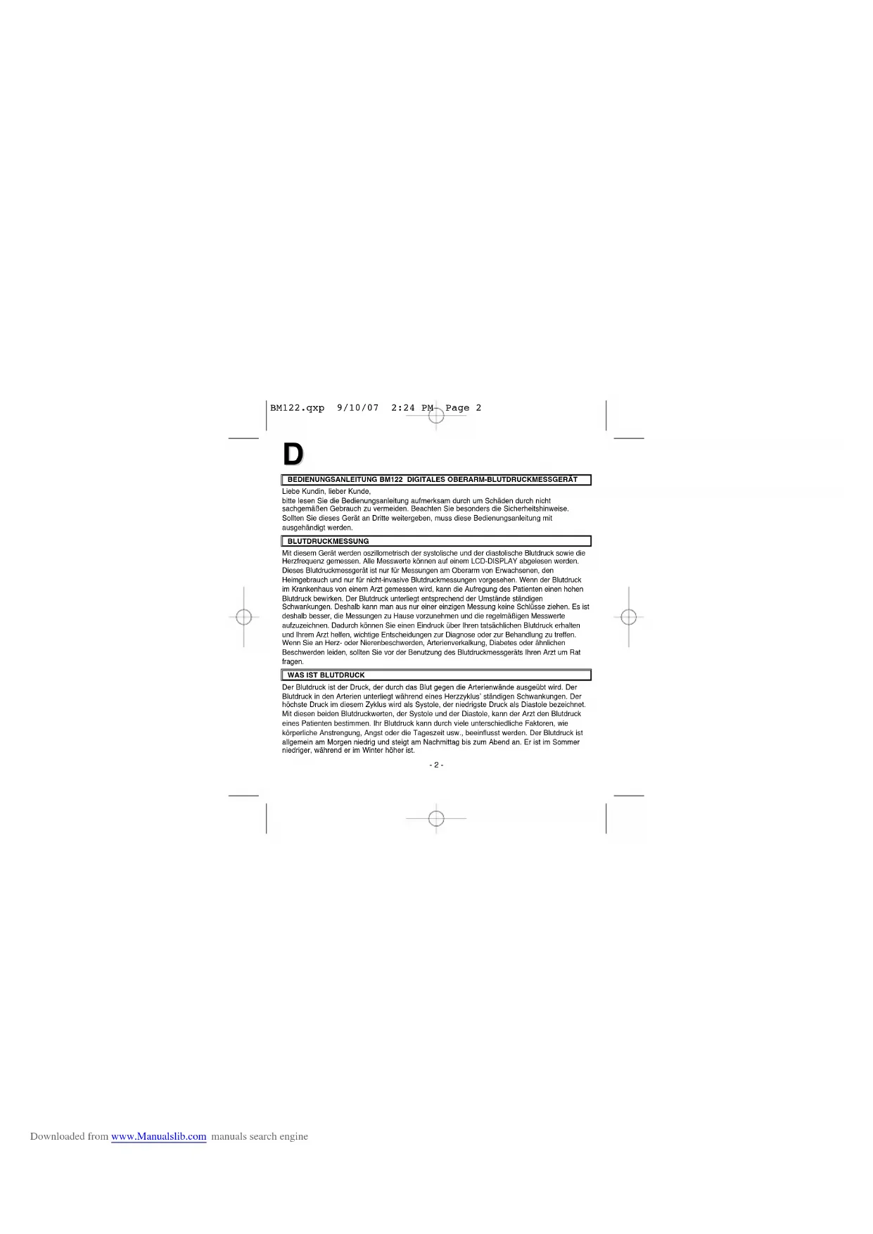 BM122.qxp 9/10/07 2:24 PM Page 3 Downloaded from www.Manualslib.com manuals search engine- 4 - VOR DEM GEBRAUCH DES MESSGERÄTES ZU BEACHTENDE HINWEISE ACHTUNG! Lesen Sie vor dem Gebrauch des Gerätes die Bedienungsanleitung. Beachten Sie die Anleitung sorgfältig. Um ungenaue Resultate durch elektromagnetische Störungen zu vermeiden, das Gerät nie in der Nähe von Mobiltelefonen oder Mikrowellengeräten benutzen