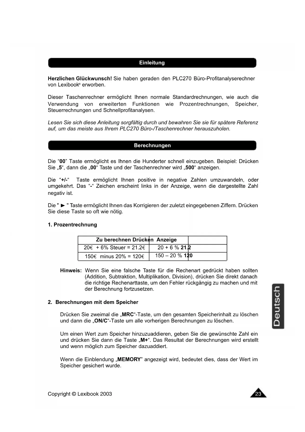 Drücken Sie zweimal die „MRC“-Taste, um den gesamten Speicherinhalt zu löschen und dann die „ON/C“-Taste um alle vorherigen Berechnungen zu löschen. Um einen Wert zum Speicher hinzuzuaddieren, geben Sie die gewünschte Zahl ein und drücken Sie dann die Taste „M+“. Das Resultat der Berechnungen wird erstellt und wenn möglich zum Speicher dazuaddiert. Wenn die Einblendung „MEMORY” angezeigt wird, bedeutet dies, dass der Wert im Speicher gesichert wurde. Zu berechnen Drücken Anzeige 20€ + 6% Steuer = 21.2€ 20 + 6 % 21.2 150€ minus 20% = 120€ 150 – 20 % 120 Berechnungen EinleitungCopyright © Lexibook 2003