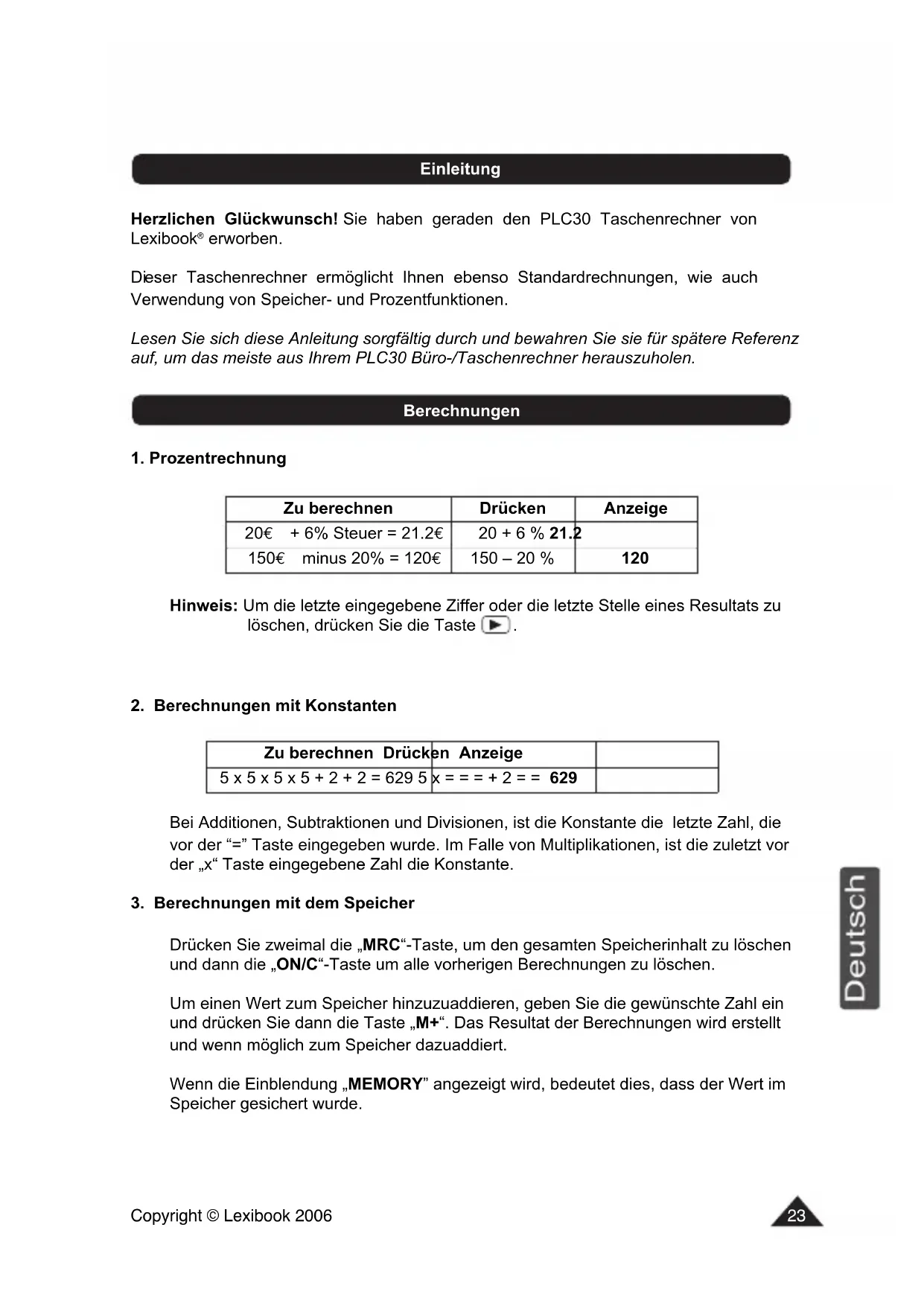 Drücken Sie zweimal die „MRC“-Taste, um den gesamten Speicherinhalt zu löschen und dann die „ON/C“-Taste um alle vorherigen Berechnungen zu löschen. Um einen Wert zum Speicher hinzuzuaddieren, geben Sie die gewünschte Zahl ein und drücken Sie dann die Taste „M+“. Das Resultat der Berechnungen wird erstellt und wenn möglich zum Speicher dazuaddiert. Wenn die Einblendung „MEMORY” angezeigt wird, bedeutet dies, dass der Wert im Speicher gesichert wurde. Zu berechnen Drücken Anzeige 5 x 5 x 5 x 5 + 2 + 2 = 629 5 x = = = + 2 = = 629 Zu berechnen Drücken Anzeige 20€ + 6% Steuer = 21.2€ 20 + 6 % 21.2 150€ minus 20% = 120€ 150 – 20 % 120 Berechnungen EinleitungCopyright © Lexibook 2006