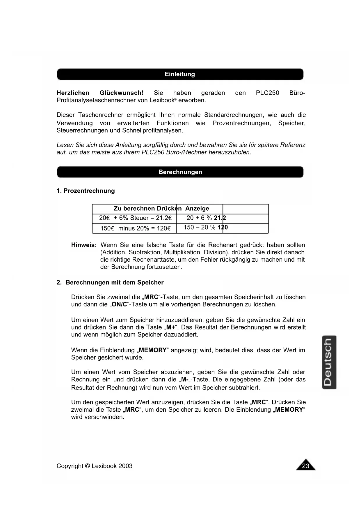 Drücken Sie zweimal die „MRC“-Taste, um den gesamten Speicherinhalt zu löschen und dann die „ON/C“-Taste um alle vorherigen Berechnungen zu löschen. Um einen Wert zum Speicher hinzuzuaddieren, geben Sie die gewünschte Zahl ein und drücken Sie dann die Taste „M+“. Das Resultat der Berechnungen wird erstellt und wenn möglich zum Speicher dazuaddiert. Wenn die Einblendung „MEMORY” angezeigt wird, bedeutet dies, dass der Wert im Speicher gesichert wurde. Um einen Wert vom Speicher abzuziehen, geben Sie die gewünschte Zahl oder Rechnung ein und drücken dann die „M-„-Taste. Die eingegebene Zahl (oder das Resultat der Rechnung) wird nun vom Wert im Speicher subtrahiert. Um den gespeicherten Wert anzuzeigen, drücken Sie die Taste „MRC“. Drücken Sie zweimal die Taste „MRC“, um den Speicher zu leeren. Die Einblendung „MEMORY“ wird verschwinden. Zu berechnen Drücken Anzeige 20€ + 6% Steuer = 21.2€ 20 + 6 % 21.2 150€ minus 20% = 120€ 150 – 20 % 120 Berechnungen EinleitungCopyright © Lexibook 2003
