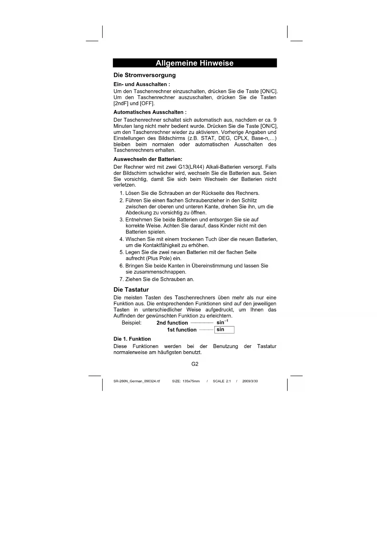 Allgemeine Hinweise Die Stromversorgung Ein- und Ausschalten : Um den Taschenrechner einzuschalten, drücken Sie die Taste [ON/C]. Um den Taschenrechner auszuschalten, drücken Sie die Tasten [2ndF] und [OFF]. Automatisches Ausschalten : Der Taschenrechner schaltet sich automatisch aus, nachdem er ca. 9 Minuten lang nicht mehr bedient wurde. Drücken Sie die Taste [ON/C], um den Taschenrechner wieder zu aktivieren. Vorherige Angaben und Einstellungen des Bildschirms (z.B. STAT, DEG, CPLX, Base-n,…) bleiben beim normalen oder automatischen Ausschalten des Taschenrechners erhalten. Auswechseln der Batterien: Der Rechner wird mit zwei G13(LR44) Alkali-Batterien versorgt. Falls der Bildschirm schwächer wird, wechseln Sie die Batterien aus. Seien Sie vorsichtig, damit Sie sich beim Wechseln der Batterien nicht verletzen.