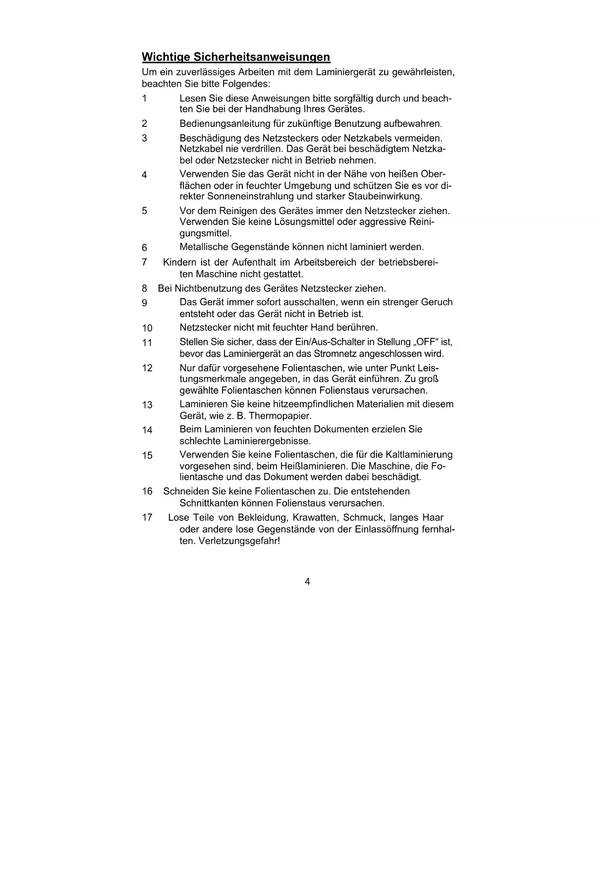 Um ein zuverlässiges Arbeiten mit dem Laminiergerät zu gewährleisten, beachten Sie bitte Folgendes:
