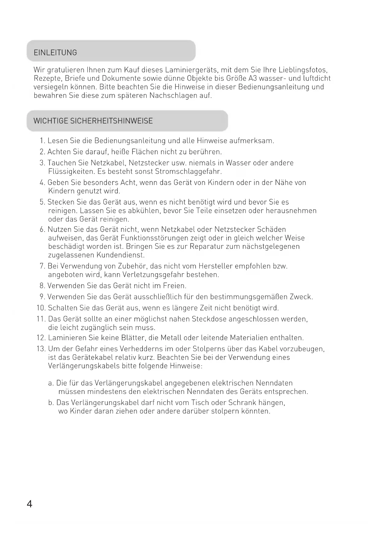 Wählen Sie Ihre Sprache. Select your language. Manual__A3Basic:Layout 1 08.09.10 17:56 Seite 34 EINLEITUNG Wir gratulieren Ihnen zum Kauf dieses Laminiergeräts, mit dem Sie Ihre Lieblingsfotos, Rezepte, Briefe und Dokumente sowie dünne Objekte bis Größe A3 wasser- und luftdicht versiegeln können. Bitte beachten Sie die Hinweise in dieser Bedienungsanleitung und bewahren Sie diese zum späteren Nachschlagen auf. WICHTIGE SICHERHEITSHINWEISE