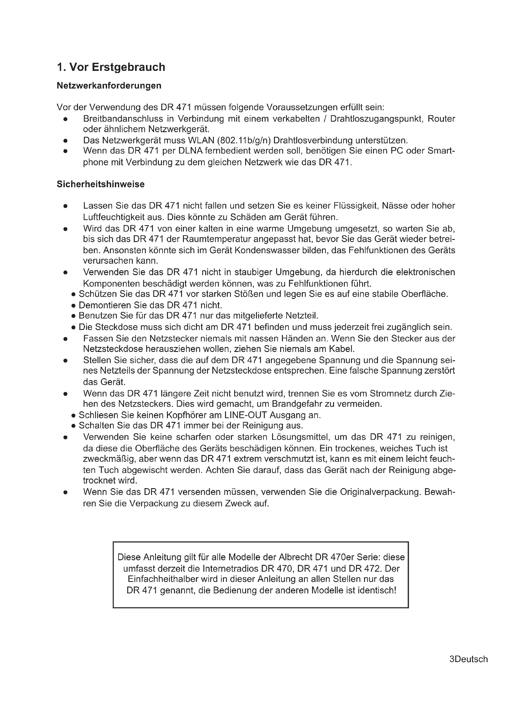 These Anleitungs gilt für alle Modelle der Albrecht DR 470er Serie: diese umfasst derzeit die Internetradios DR 470, DR 471 und DR 472. Der Einfachtheithalber wird in dieser Anleitung an allen Stellen nur das DR 471 genannot, die Bedienung der anderen Modelle ist identisch!