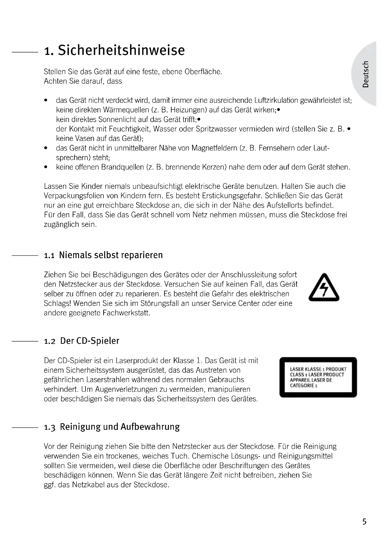 Der CD-Spieler ist ein Laserprodukt der Klasse 1. Das Gerät ist mit einem Sicherheitssystem ausgerüstet, das das Austreten von gefährlichen Laserstrahlen während des normalen Gebrauchs verhindert. Um Augenverletzungen zu vermeiden, manipulieren oder beschädigen Sie niemals das Sicherheitssystem des Gerätes.