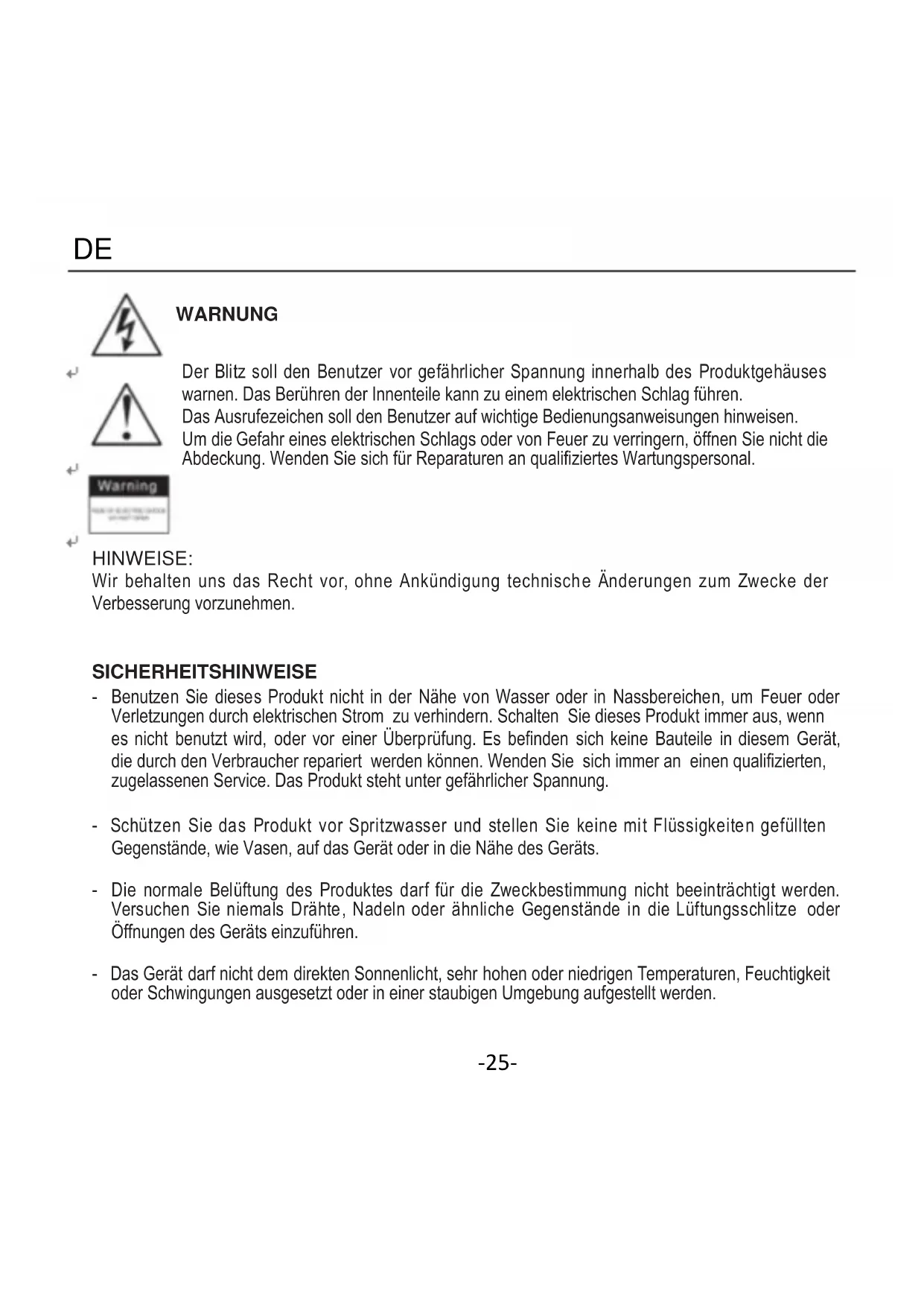 HINWEISE: Wir behalten uns das Recht vor, ohne Ankündigung technische Änderungen zum Zwecke der Verbesserung vorzunehmen. SICHERHEITSHINWEISE - Benutzen Sie dieses Produkt nicht in der Nähe von Wasser oder in Nassbereichen, um Feuer oder Verletzungen durch elektrischen Strom zu verhindern. Schalten Sie dieses Produkt immer aus, wenn es nicht benutzt wird, oder vor einer Überprüfung. Es befinden sich keine Bauteile in diesem Gerät, die durch den Verbraucher repariert werden können. Wenden Sie sich immer an einen qualifizierten, zugelassenen Service. Das Produkt steht unter gefährlicher Spannung. - Schützen Sie das Produkt vor Spritzwasser und stellen Sie keine mit Flüssigkeiten gefüllten Gegenstände, wie Vasen, auf das Gerät oder in die Nähe des Geräts. - Die normale Belüftung des Produktes darf für die Zweckbestimmung nicht beeinträchtigt werden. Versuchen Sie niemals Drähte, Nadeln oder ähnliche Gegenstände in die Lüftungsschlitze oder Öffnungen des Geräts einzuführen. - Das Gerät darf nicht dem direkten Sonnenlicht, sehr hohen oder niedrigen Temperaturen, Feuchtigkeit oder Schwingungen ausgesetzt oder in einer staubigen Umgebung aufgestellt werden.DE